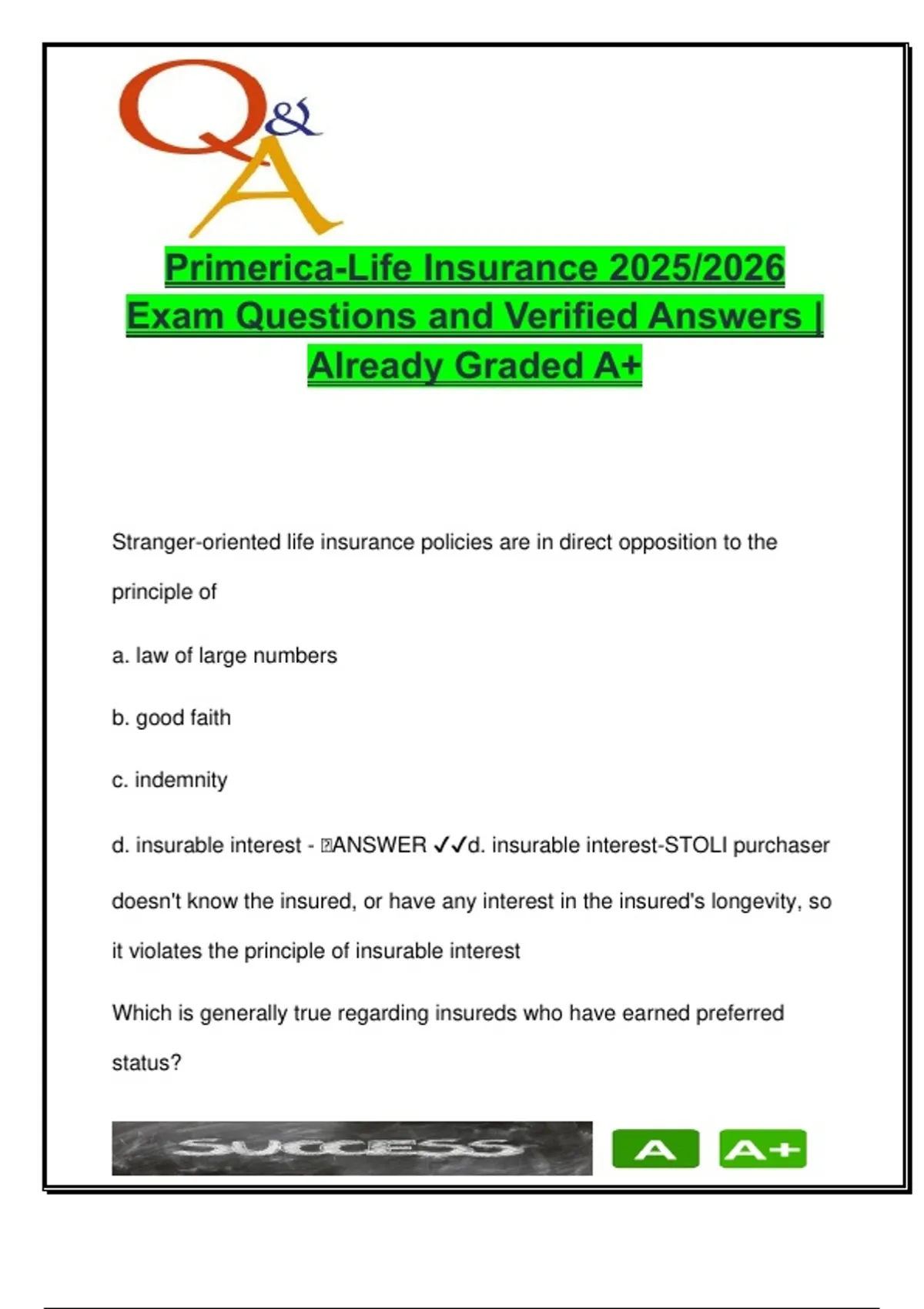 This document provides a comprehensive set of over 100 expertly verified questions and answers designed to prepare candidates for the Primerica Life Insurance licensing exams for the 2025/2026 testing cycle. All content is structured in clear Q&A format and reflects real-life licensing questions, already graded with A+ accuracy. The material covers core principles of life insurance, with detailed explanations provided for every answer to support deep understanding and practical recall. Key topics include: Insurable interest, underwriting, and risk classifications (standard, substandard, preferred) Policy types (term, whole, universal, variable, and executive bonus plans) Legal provisions (beneficiary rules, incontestability, riders, and non-forfeiture options) Business-related applications (key person insurance, cross purchase and stock redemption plans) Tax treatment, MIB, settlement options, and Social Security concepts like the blackout period This document is especially useful for individuals preparing for life insurance agent certification exams in the United States, particularly those affiliated with or studying through Primerica’s training programs. Ideal for: Insurance licensing candidates in the US Financial services trainees (Primerica, State Farm, Allstate, etc.) Business students, risk management and finance majors, and those pursuing a career in insurance sales or advising Keywords: life insurance exam prep, insurable interest, policy types, executive bonus, underwriting process, insurance riders, blackout period, key person insurance, cross purchase, stock redemption, primerica licensing, variable life, standard risk, non-forfeiture options, insurance taxation