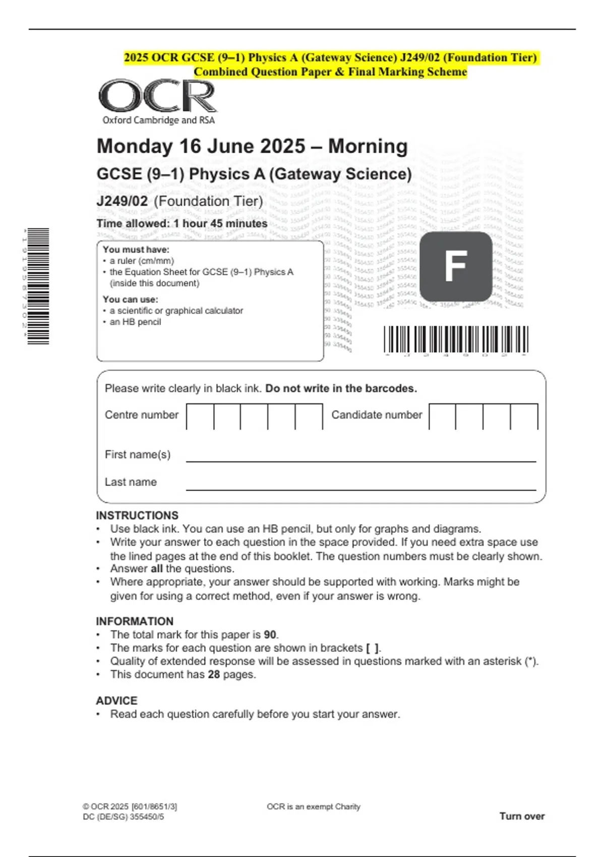 2025 OCR GCSE (9–1) Physics A (Gateway Science) J249/02 (Foundation Tier) Combined Question Paper & Final Marking Scheme