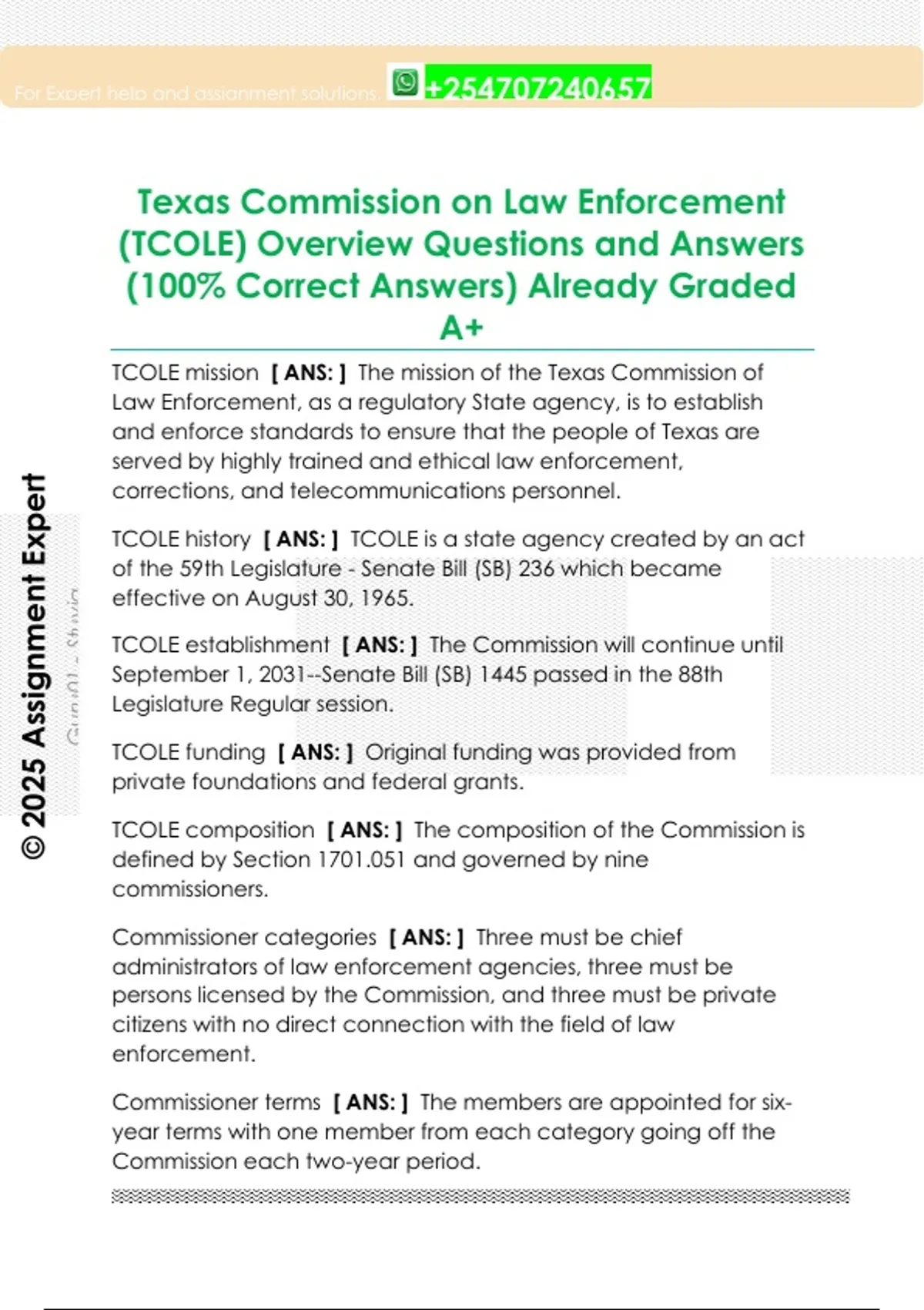 Texas Commission on Law Enforcement (TCOLE) Overview Questions and Answers (100% Correct Answers) Already Graded A+