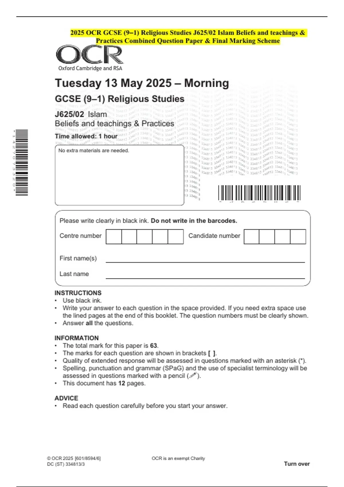 • The total mark for this paper is 63.