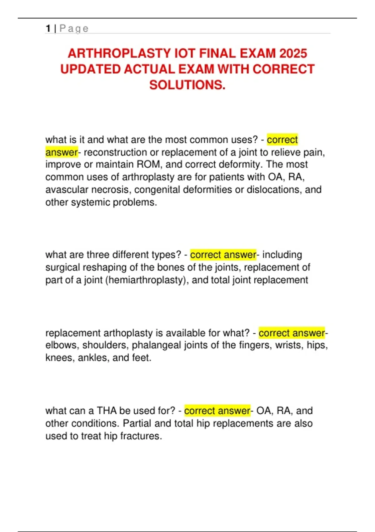 INSTANT PDF DOWNLOAD. This Arthroplasty IOT Final Exam 2025 guide provides the fully updated version of the actual exam with verified correct solutions. It covers comprehensive topics in joint replacement surgery, including preoperative assessment, prosthesis selection, surgical techniques, postoperative care, and rehabilitation. Designed for orthopedic students and professionals, this accurate and complete resource ensures thorough understanding and effective preparation for the 2025 IOT Arthroplasty Final Exam.