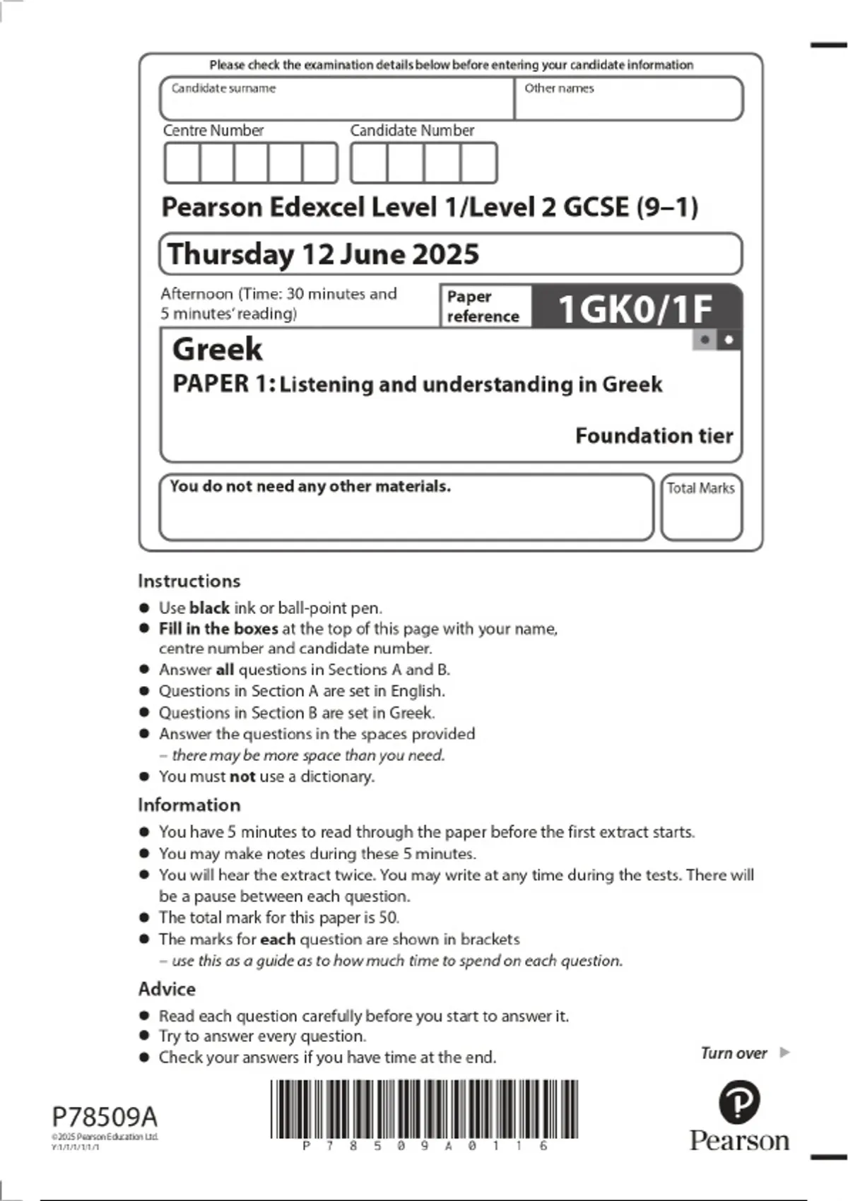 2025 Pearson Edexcel Level 1/Level 2 GCSE (9–1) Greek PAPER 1: Listening and understanding in Greek Foundation tier Combined Question Paper & Marking Scheme