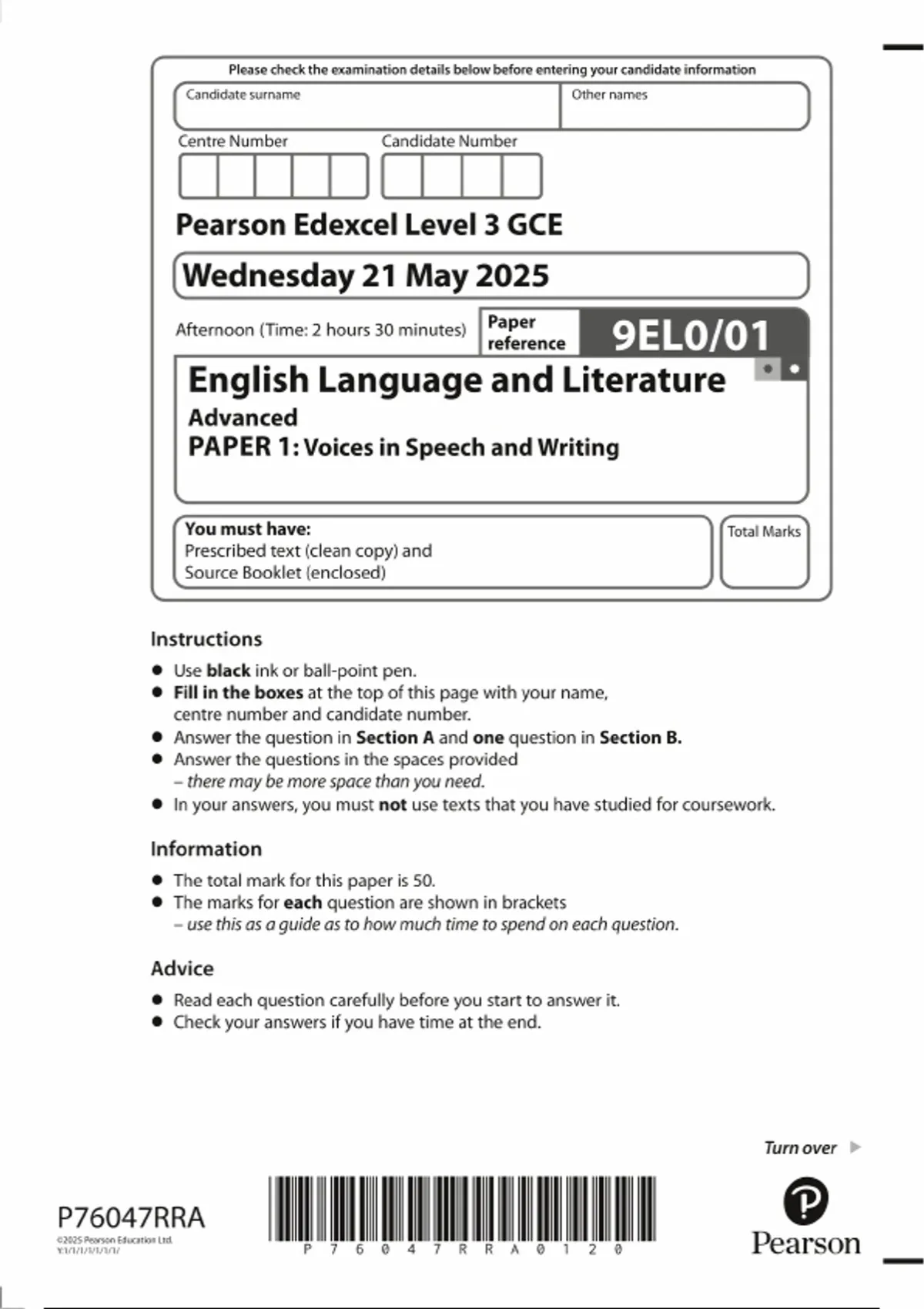 2025 Pearson Edexcel A LEVEL English Language and Literature PAPER 1 QUESTION PAPER (9EL0/01 : Voices in Speech and Writing
