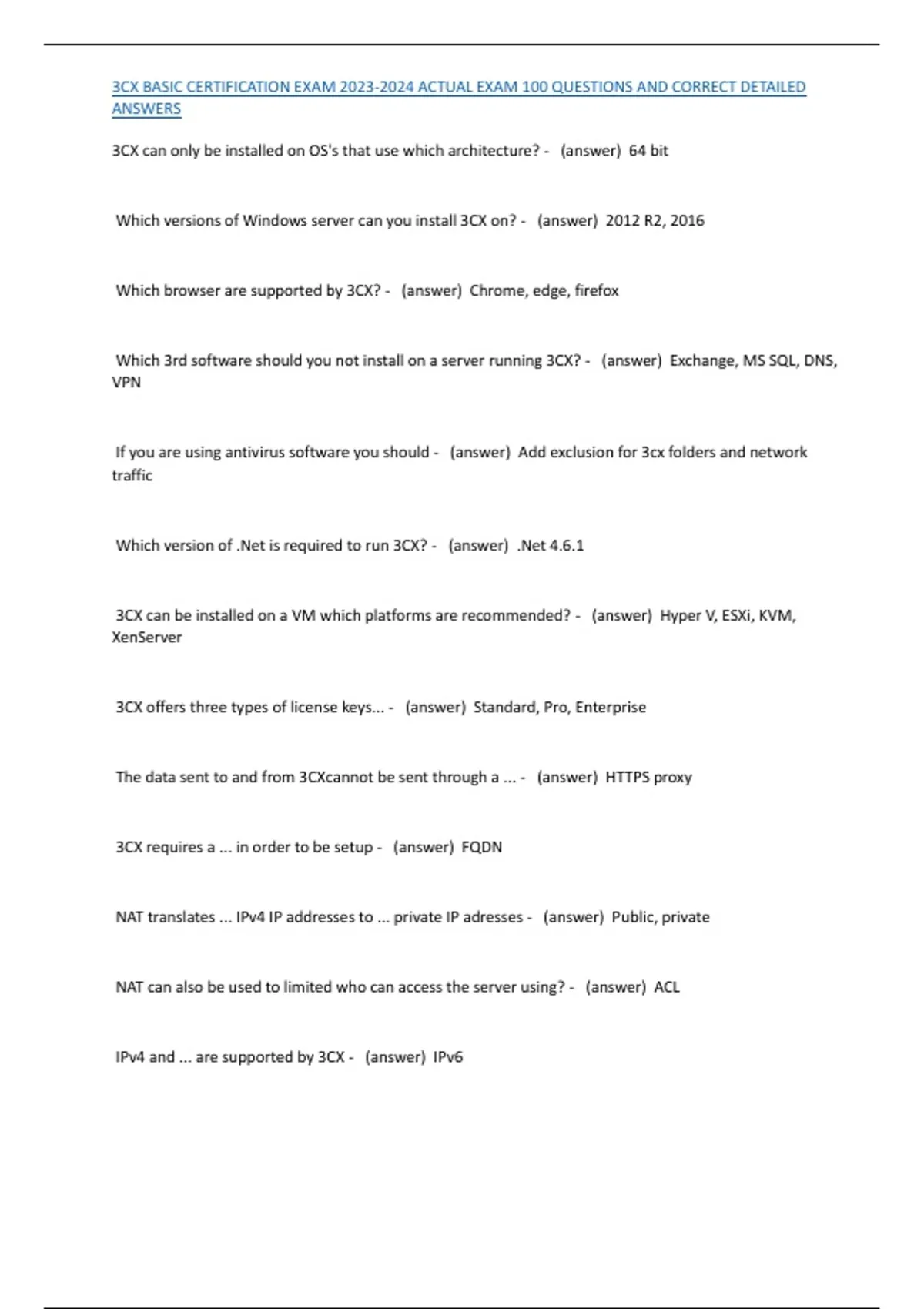 3CX BASIC CERTIFICATION EXAM 2023-2024 ACTUAL EXAM 100 QUESTIONS AND CORRECT DETAILED