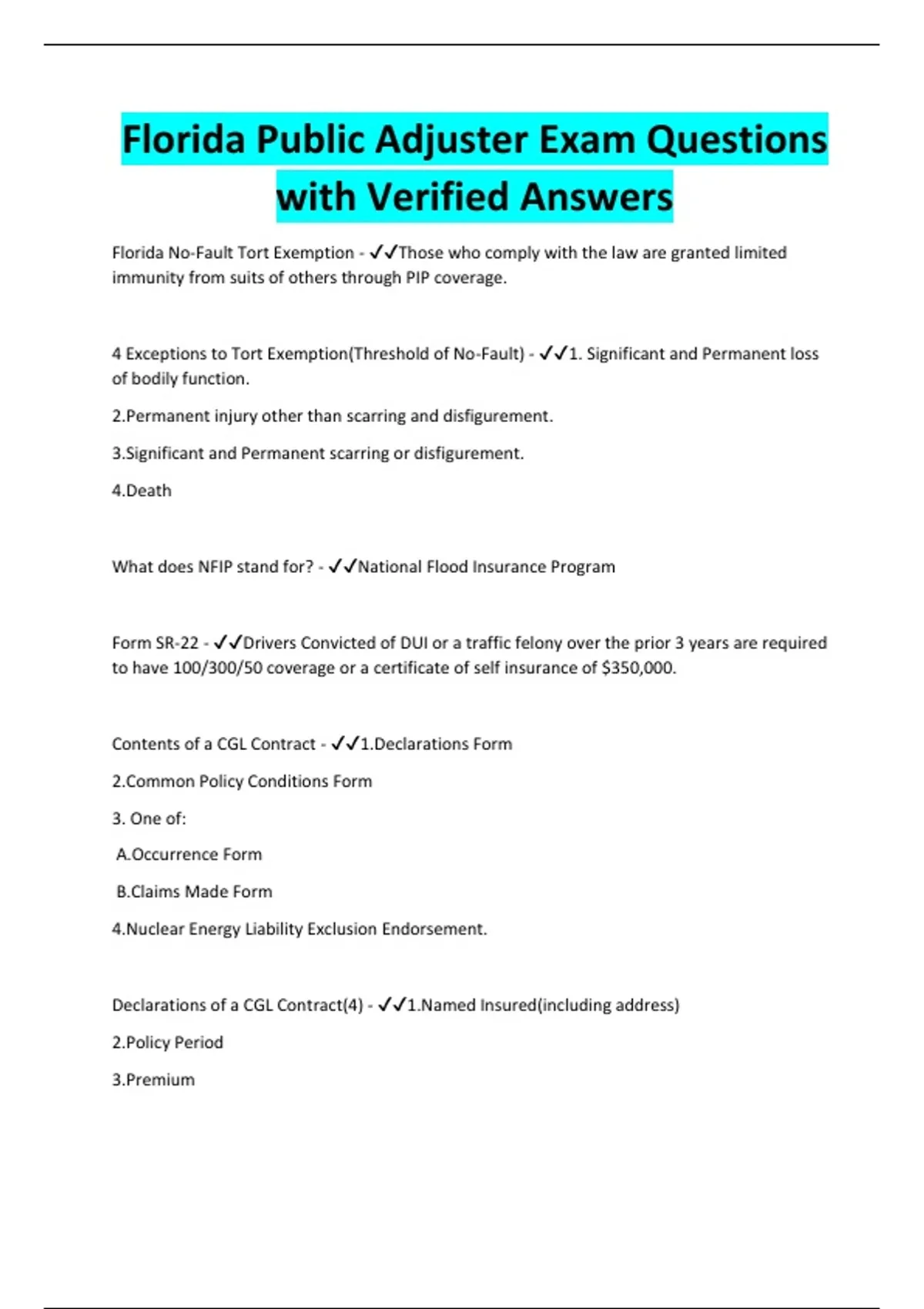 Florida Public Adjuster Exam Questions with Verified Answers