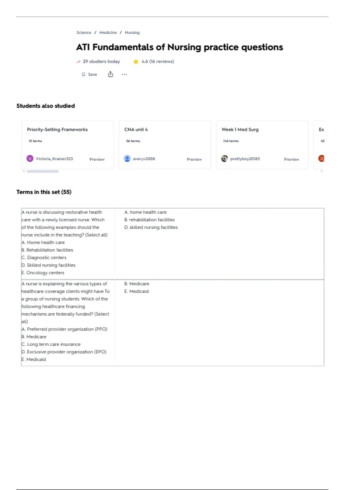 Ace your ATI Fundamentals of Nursing exam with this comprehensive collection of practice questions and verified answers! This essential study guide is packed with practice questions directly aligned with the ATI Fundamentals proctored exam content. It is the perfect resource to test your knowledge, identify weak areas, and build confidence before the big day. What's inside: 200+ Practice Questions & Answers: Covering all critical topics from the ATI Fundamentals curriculum. Verified Solutions: Each question includes the correct answer, so you can study efficiently. Detailed Rationales: Many answers include clear explanations and rationales to deepen your understanding of the "why" behind each concept. Comprehensive Content Review: Use this document as a final review to ensure you're fully prepared. Key Topics Covered: Health Care Systems & Settings (Restorative Care, Medicare/Medicaid) Ethical & Legal Principles (Autonomy, Beneficence, Informed Consent, Torts) Nursing Process & Critical Thinking (ADPIE, Objective vs. Subjective Data) Delegation & Supervision (Five Rights of Delegation, RN vs. LPN vs. CNA Roles) Infection Control & Safety (Sterile Technique, Transmission-Based Precautions, Stages of Infection) Admission, Transfer, & Discharge Planning Interprofessional Collaboration & Referrals Why choose this guide? Targeted Preparation: Focuses specifically on the types of questions you will see on the ATI exam. Instant Feedback: Check your answers immediately to reinforce learning. Boost Your Score: Identify your strengths and weaknesses to optimize your study time.