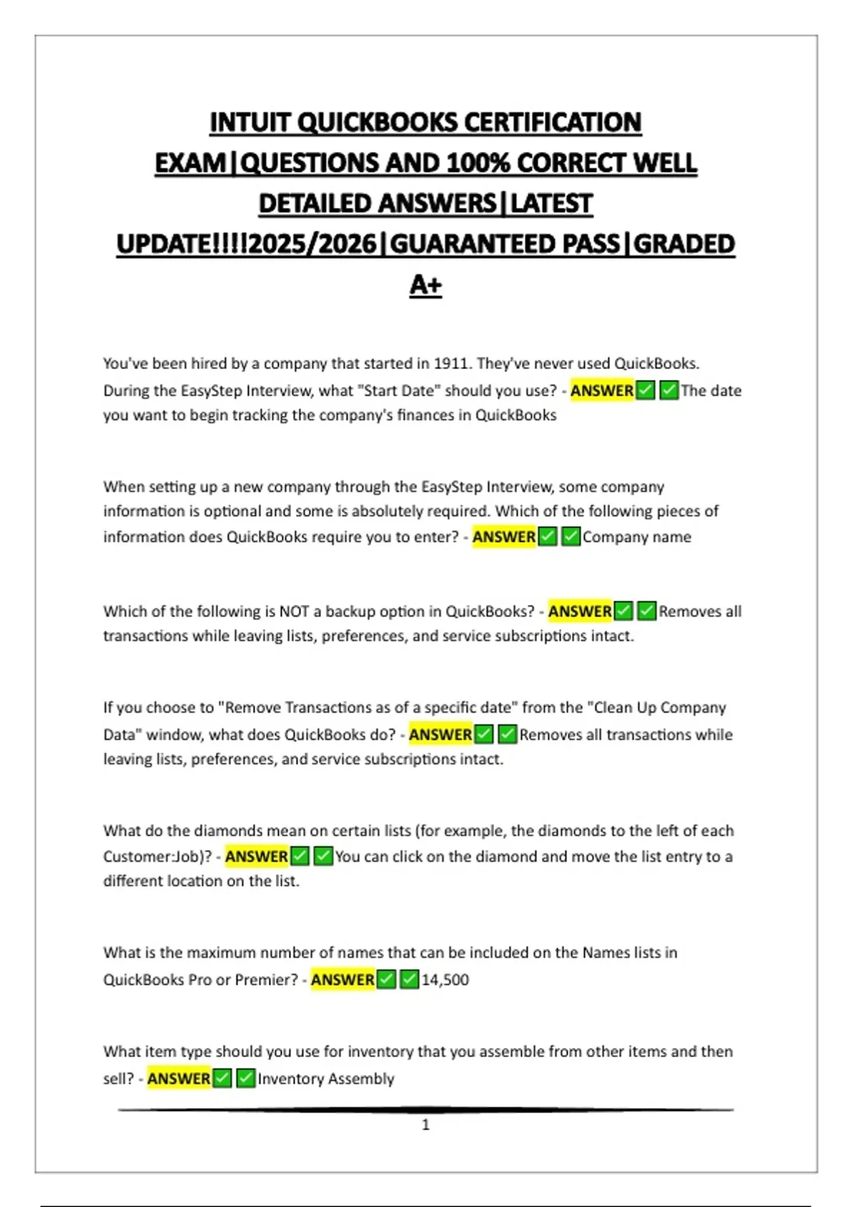 INTUIT QUICKBOOKS CERTIFICATION EXAM|QUESTIONS AND 100% CORRECT WELL DETAILED ANSWERS|LATEST UPDATE!!!!2025/2026|GUARANTEED PASS|GRADED A+