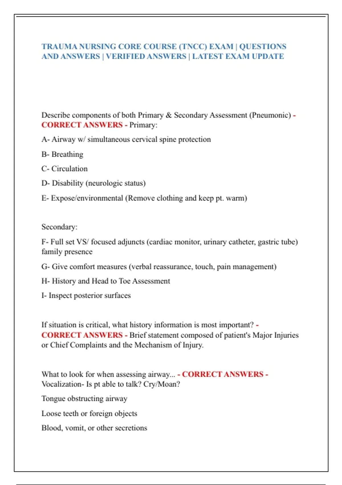 TRAUMA NURSING CORE COURSE (TNCC) EXAM | QUESTIONS