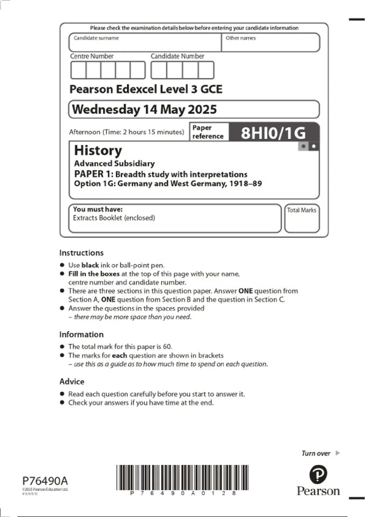 2025 Pearson Edexcel Level 3 GCE History Advanced Subsidiary PAPER 1: Breadth study with interpretations Option 1G: Germany and West Germany, 1918–89 Combined Question Paper & Final Marking Scheme