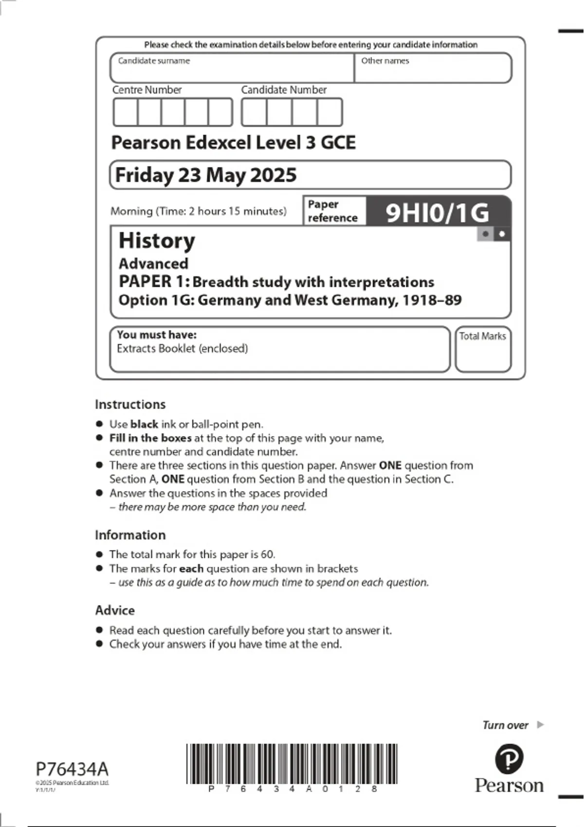 2025 Pearson Edexcel Level 3 GCE History Advanced PAPER 1: Breadth study with interpretations Option 1G: Germany and West Germany, 1918–89Combined Question Paper & Final Marking Scheme
