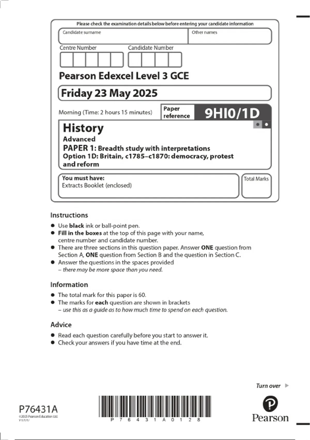 2025 Pearson Edexcel Level 3 GCE History Advanced PAPER 1: Breadth study with interpretations Option 1D: Britain, c1785–c1870: democracy, protest and reform Combined Question Paper & Final Marking Scheme