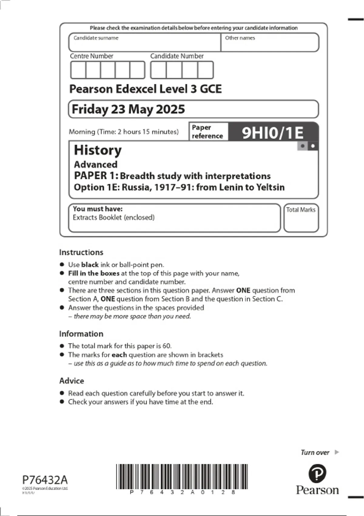 2025 Pearson Edexcel Level 3 GCE History Advanced PAPER 1: Breadth study with interpretations Option 1E: Russia, 1917–91: from Lenin to Yeltsin Combined Question Paper & Final Marking Scheme