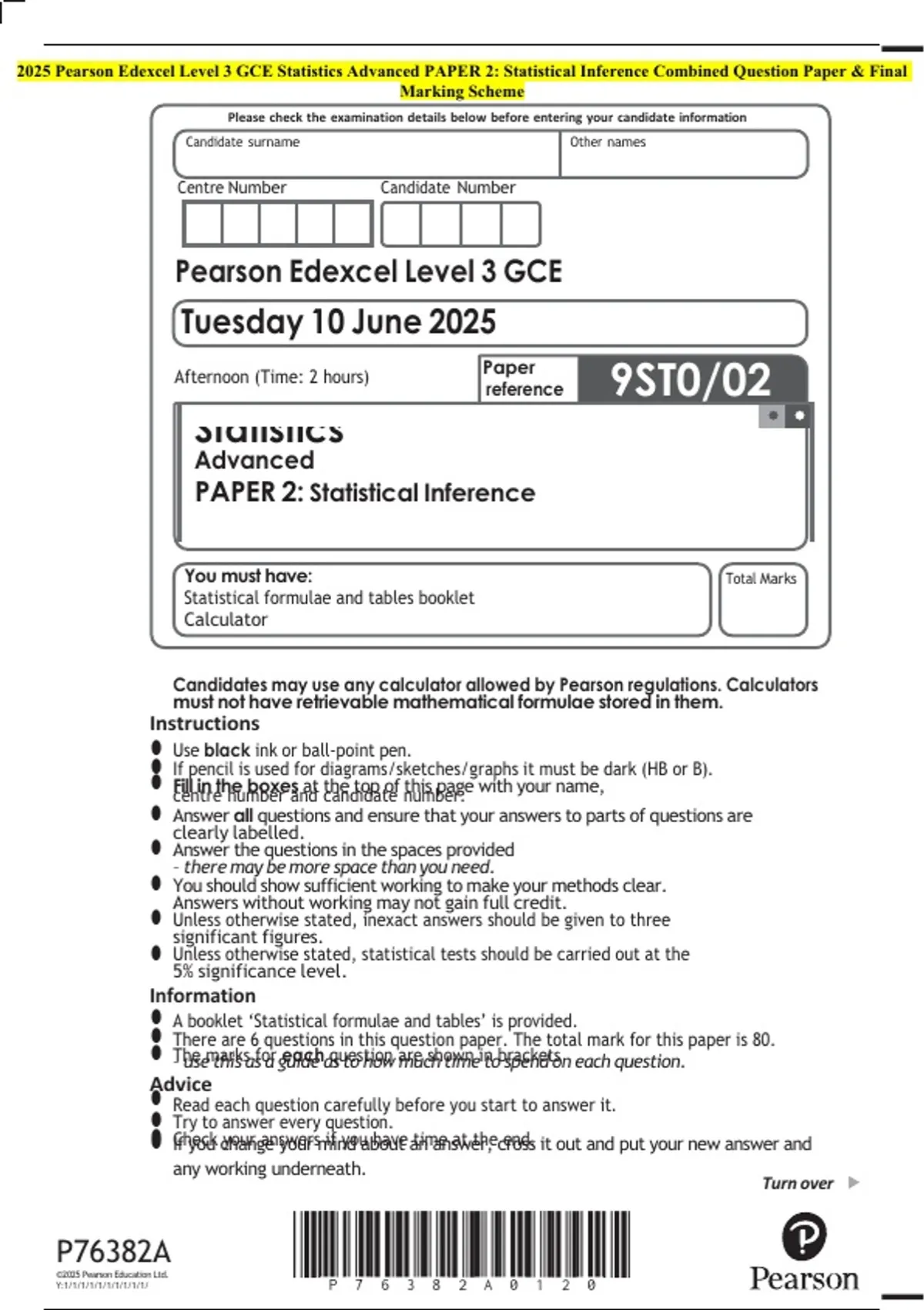 2025 Pearson Edexcel Level 3 GCE Statistics Advanced PAPER 2: Statistical Inference Combined Question Paper & Final
