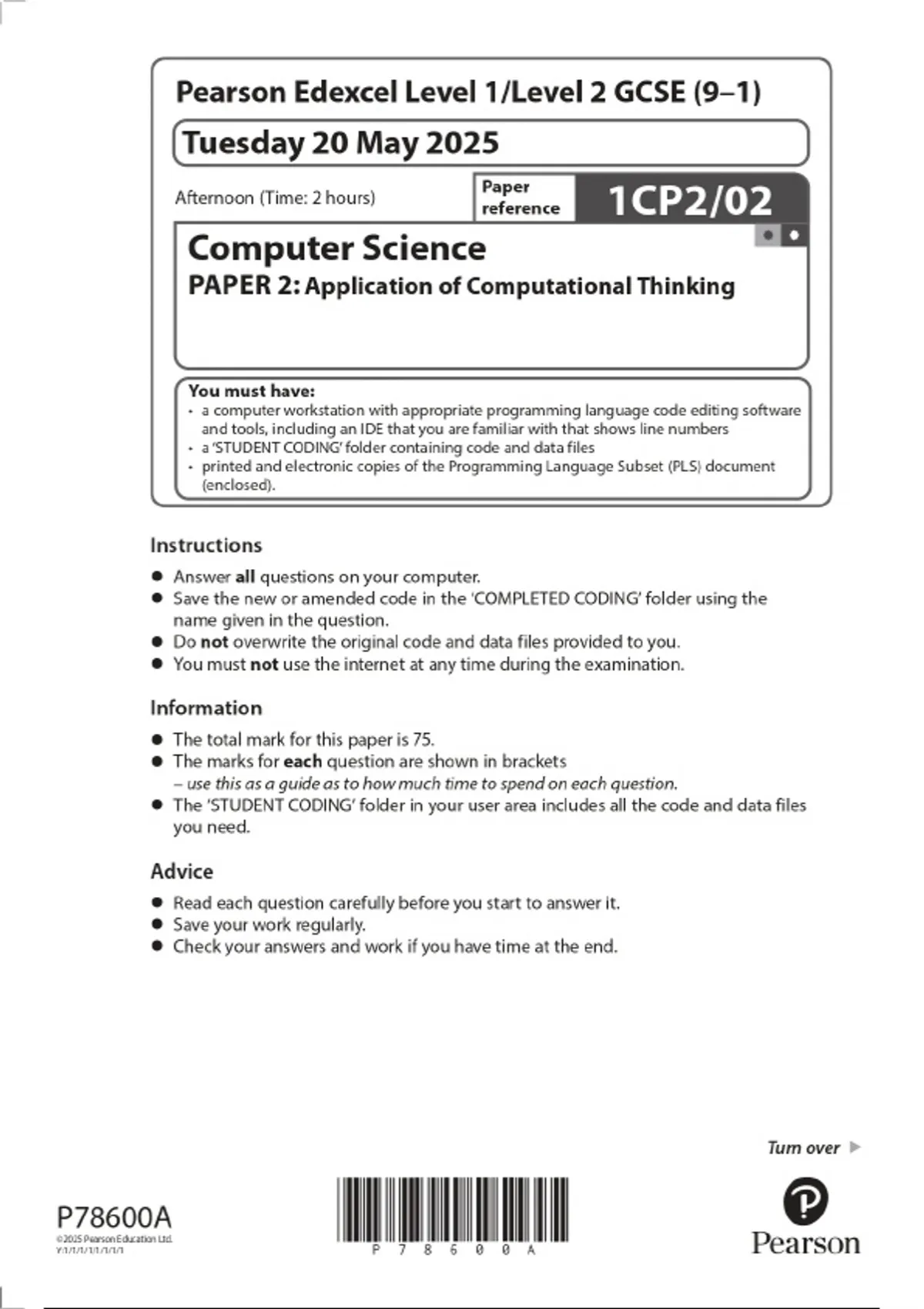 2025 Pearson Edexcel Level 1/Level 2 GCSE (9–1) Computer Science PAPER 2: Application of Computational Thinking Combined Question Paper & Marking Scheme