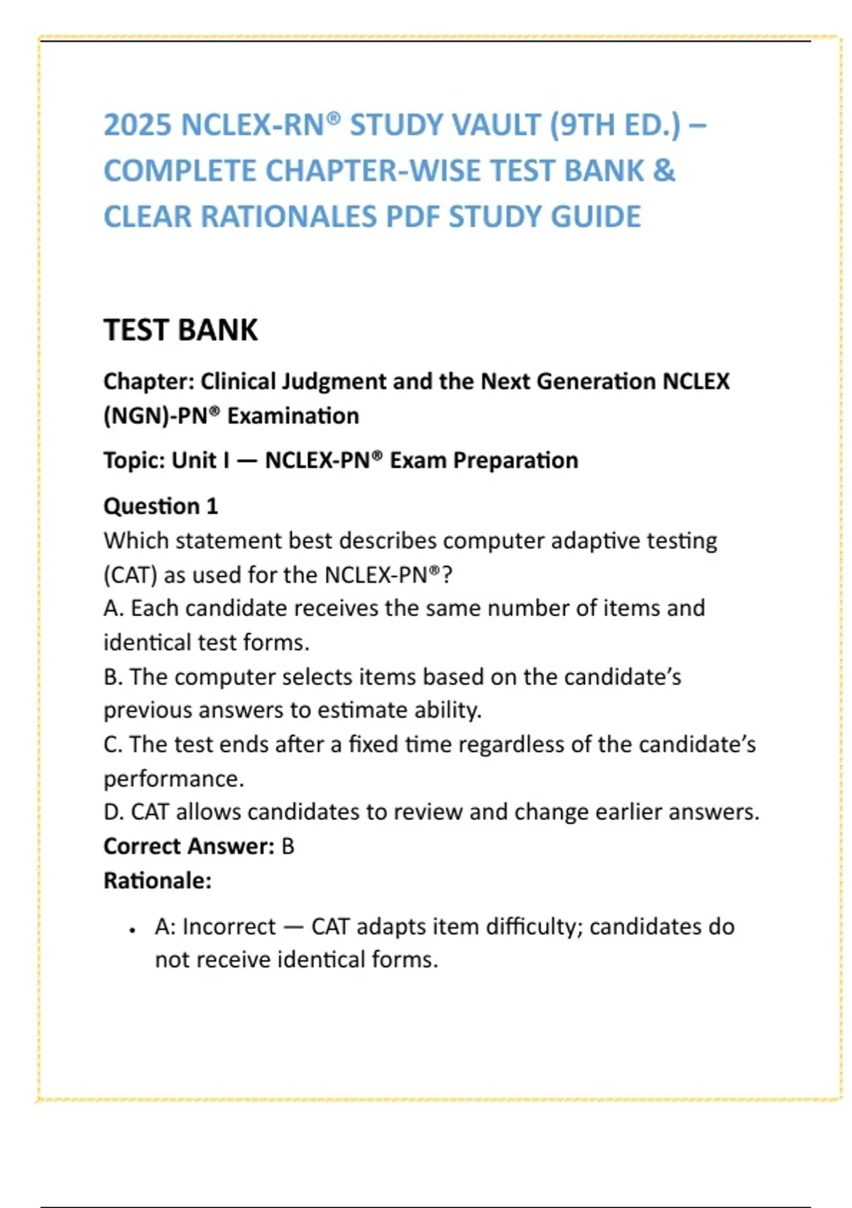 NCLEX-PN 2025 Practice Qs — 70 Chapters PDF NCLEX-PN 2025 Test Bank | 70 Chapters | 20 Saunders-Style MCQs + Rationales per Chapter | PDF Download Original NCLEX-PN 2025 Study Guide — 70 Chapters, 20 Saunders-style MCQs + detailed rationales each (1,400 Qs total). Original content; not the Saunders textbook. PDF. 10 SEO keywords (comma-separated, numbered) NCLEX-PN 2025 practice questions, NCLEX PN test bank PDF, Saunders-style NCLEX PN study guide, NCLEX PN chapter questions, NCLEX PN rationales download, PN board exam review questions, LPN NCLEX practice PDF, chapterwise NCLEX PN prep, nursing exam PDF test bank, NCLEX PN companion guide 10 hashtags (comma-separated) #NCLEXPN #PNExamPrep #LPNStudent #NursingSchoolHelp #SaundersStyle #NurseLife #FutureNurse #NursingReview #NCLEXPractice #StudyNurse Short description (150–220 chars) Master NCLEX-PN 2025 with 70 chapters of original, Saunders-style practice — 20 MCQs + detailed rationales per chapter (1,400 total). PDF instant download. Build confidence, speed, and exam-ready thinking. Long description (450–900 chars) NCLEX-PN 2025 practice starts here — chapter-based, real-exam style questions that sharpen clinical judgment fast. This Saunders-style NCLEX-PN companion includes: • 70 chapters (aligned to Saunders 9th Ed.) • 20 MCQs + rationales per chapter — 1,400 total • Exam-style wording, difficulty progression, priority questions • Clinical reasoning + safety emphasis • Mobile-friendly PDF for study anywhere What’s included: 1,400 original NCLEX-PN-style MCQs Detailed rationales for every answer Chapter-by-chapter structure for focused review Test-taking strategy notes in rationales Progressive difficulty + common NCLEX traps highlighted This is an original student-authored study guide — not the Saunders textbook. 30-day satisfaction: refund if misrepresented. Download the PDF now and start mastering NCLEX-PN questions chapter by chapter.
