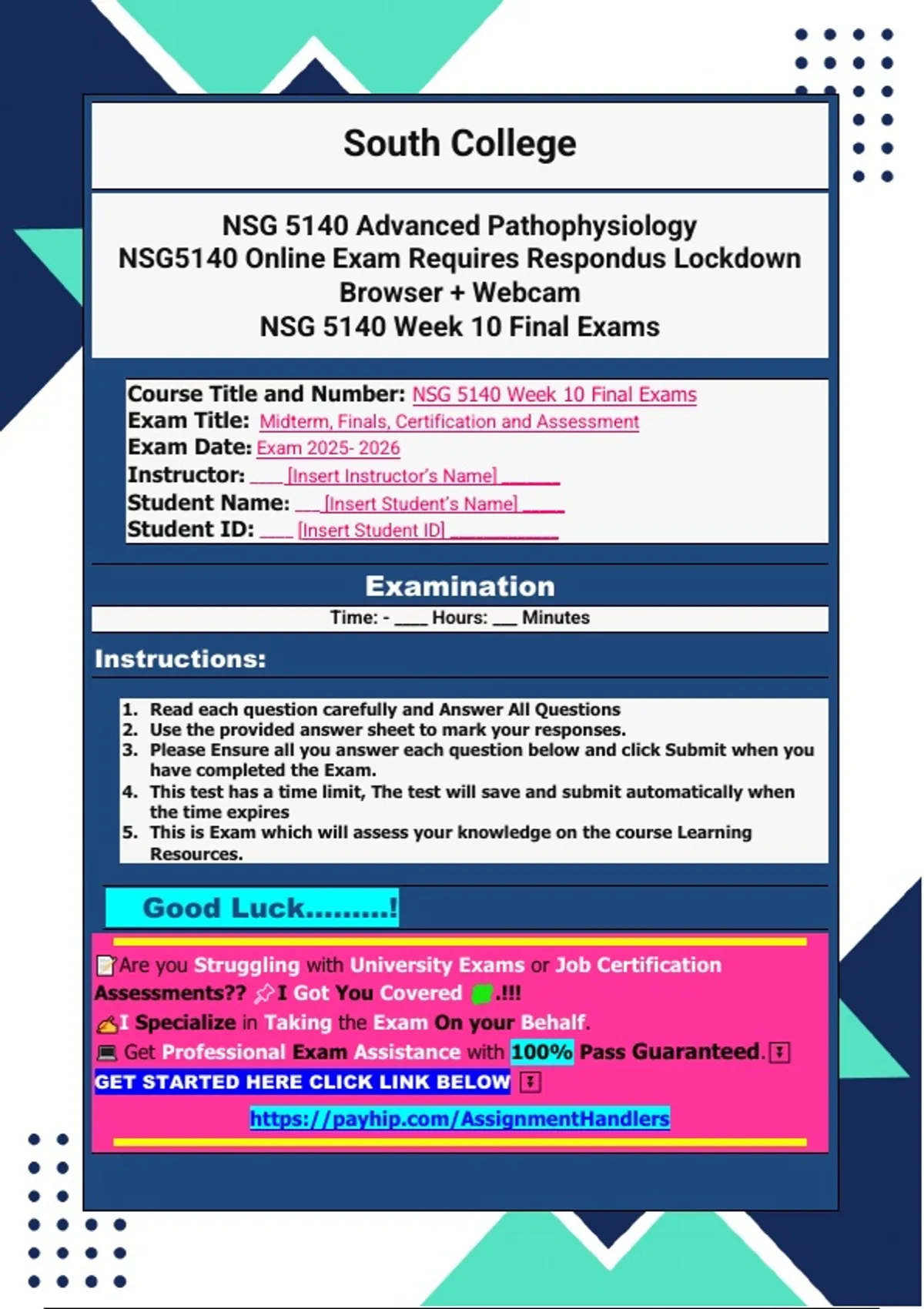 NSG 5140 Week 10 Final Exam Due 26th October Complete Actual Exam Questions 1- 50 Screenshots NSG 5140 Advanced Pathophysiology NSG5140 Online Exam Requires Respondus Lockdown Browser + Webcam Exam Questions and Answers | 100% Pass Guaranteed | Graded A+ | NSG 5140 Week 10 Final Exams NSG5140 Online Exam Requires Respondus Lockdown Browser + Webcam. NSG 5140 Advanced Pathophysiology South College