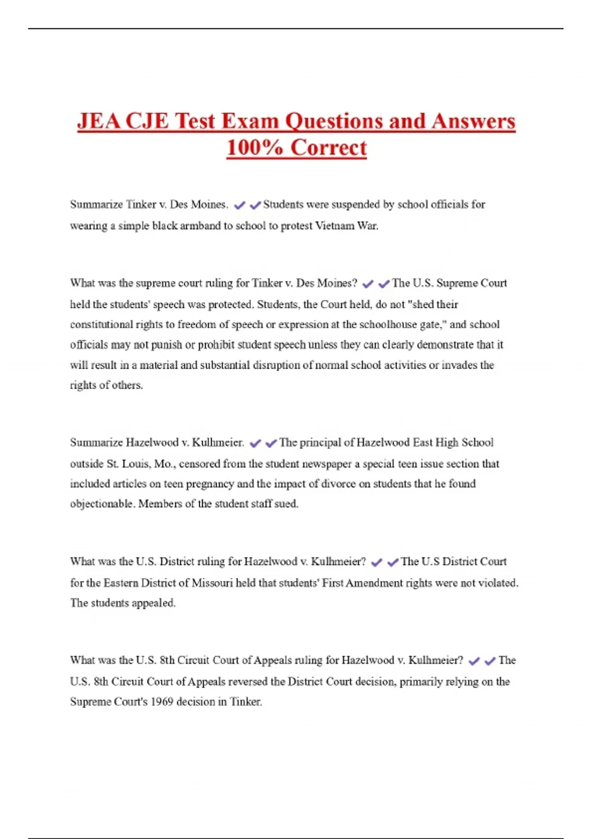 JEA CJE Test Exam Questions and Answers 100% Correct Summarize Tinker v. Des Moines. Students were suspended by school officials for wearing a simple black armband to school to protest Vietnam War. What was the supreme court ruling for Tinker v. Des Moines? The U.S. Supreme Court held the students' speech was protected. Students, the Court held, do not "shed their constitutional rights to freedom of speech or expression at the schoolhouse gate," and school officials may not punish or prohibit student speech unless they can clearly demonstrate that it will result in a material and substantial disruption of normal school activities or invades the rights of others. Summarize Hazelwood v. Kulhmeier. The principal of Hazelwood East High School outside St. Louis, Mo., censored from the student newspaper a special teen issue section that included articles on teen pregnancy and the impact of divorce on students that he found objectionable. Members of the student staff sued.