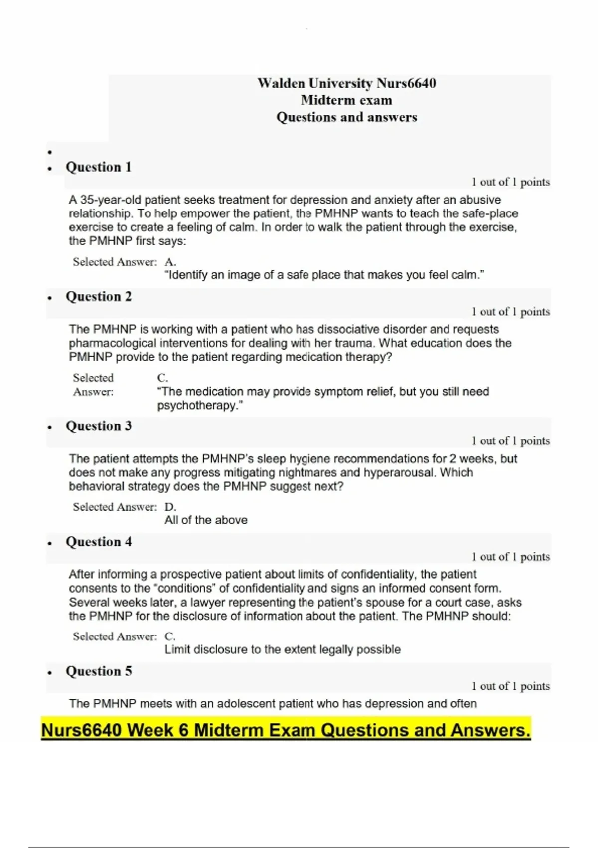 Nurs6640 Week 6 Midterm Exam Questions and Answers.