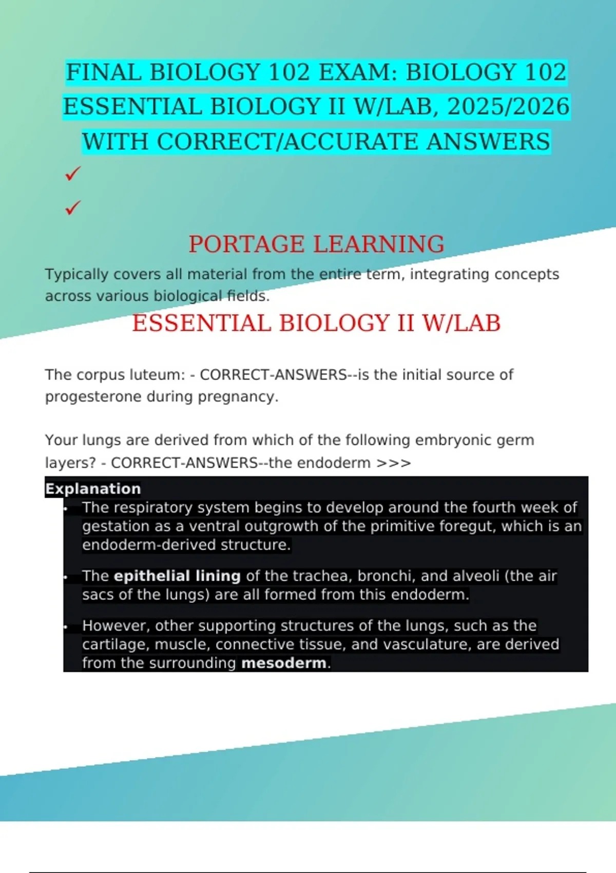 FINAL BIOLOGY 102 EXAM: BIOLOGY 102 ESSENTIAL BIOLOGY II W/LAB, 2025/2026 WITH CORRECT/ACCURATE ANSWERS