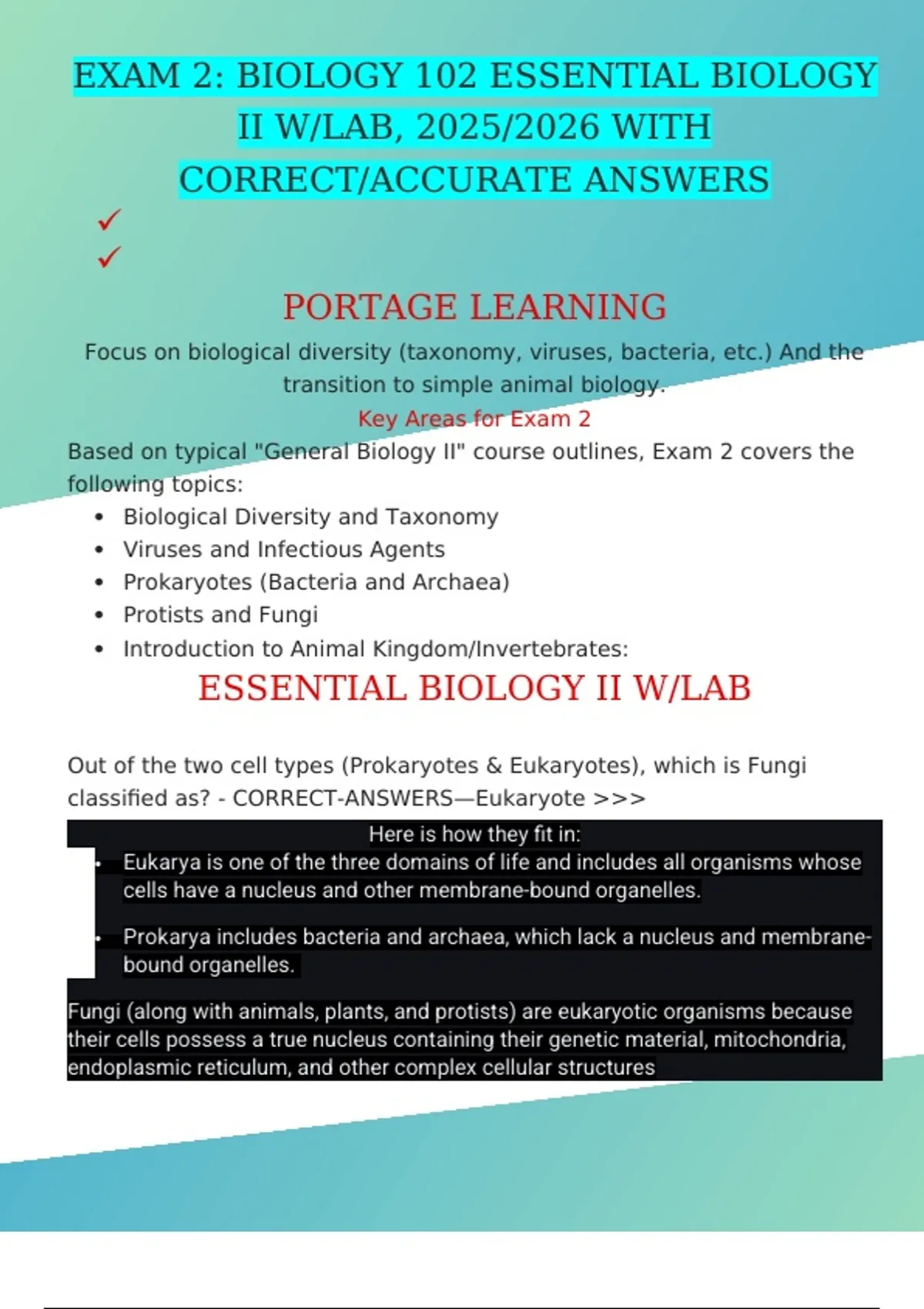 EXAM 2: BIOLOGY 102 ESSENTIAL BIOLOGY II W/LAB, 2025/2026 WITH CORRECT/ACCURATE ANSWERS
