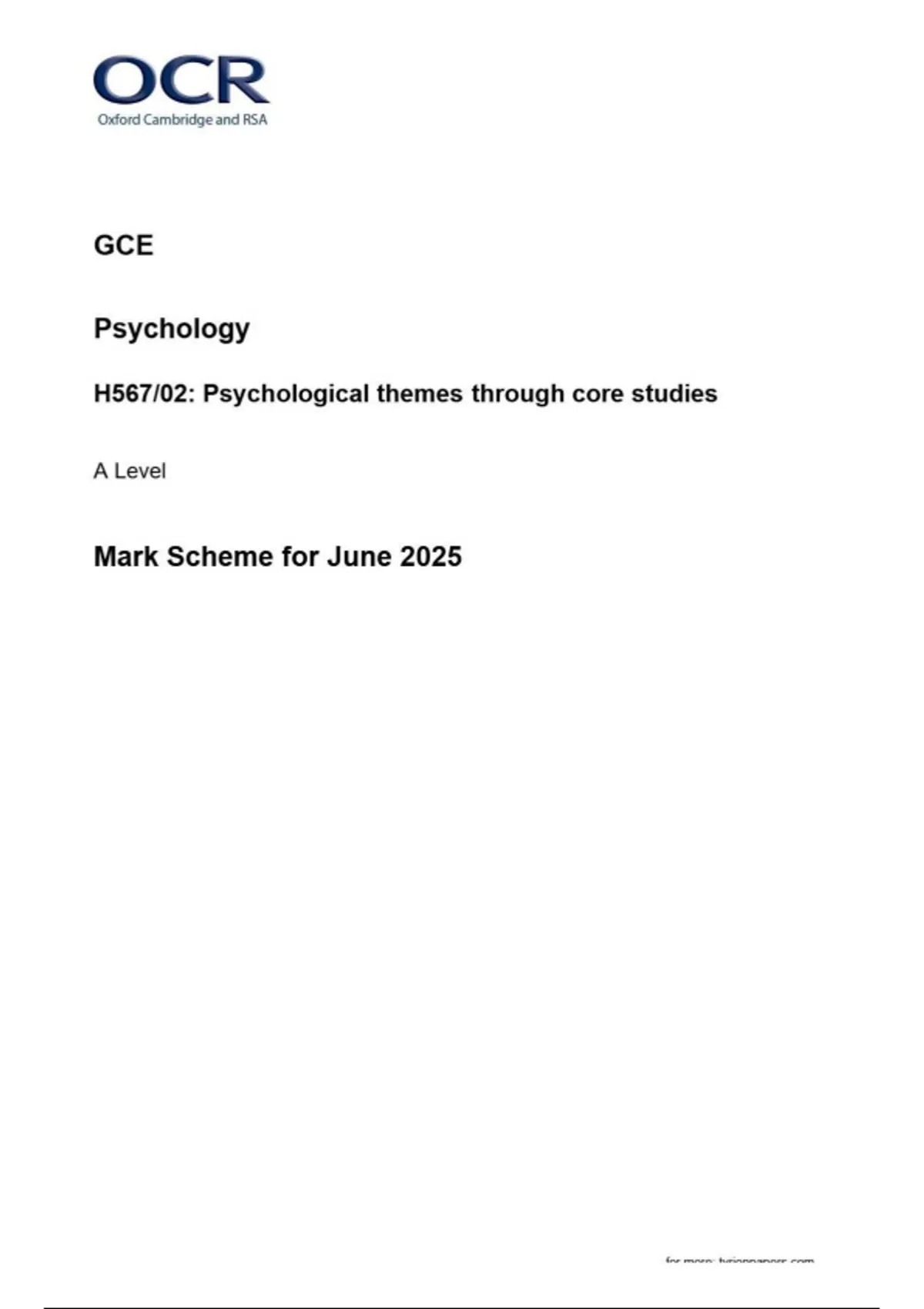 OCR GCE Psychology H567/02: Psychological themes through core studies A Level Mark Scheme for June 2025