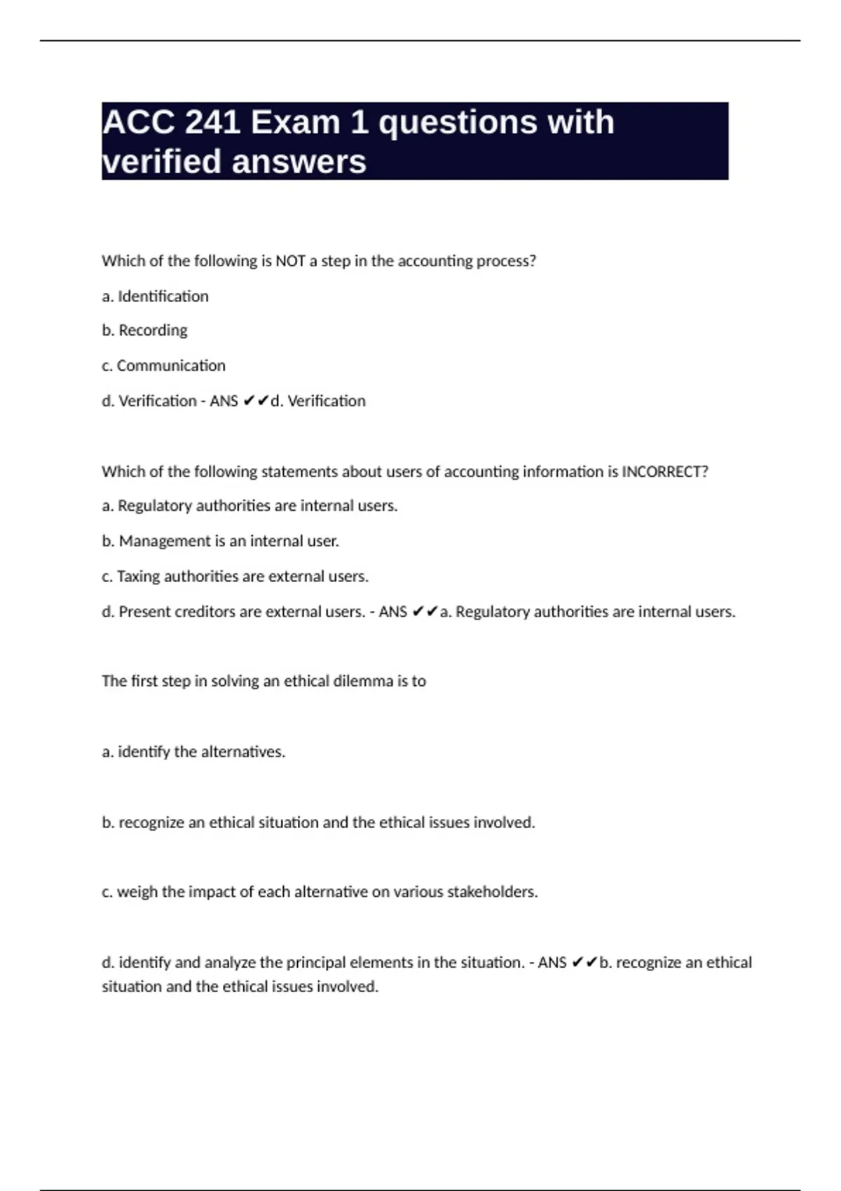 d. Present creditors are external users. - ANS ✔✔a. Regulatory authorities are internal users.