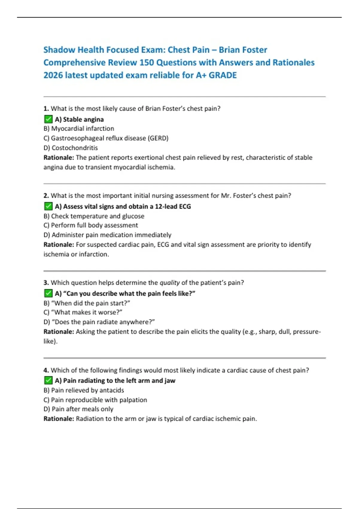 Shadow Health Focused Exam: Chest Pain – Brian Foster Comprehensive Review 150 Questions with Answers and Rationales 2026 latest updated exam reliable for A+ GRADE