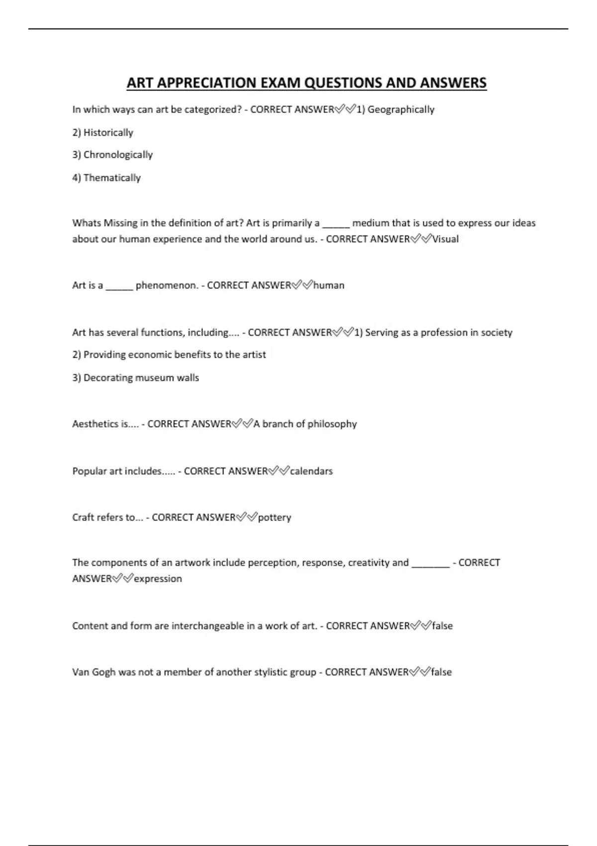 ART APPRECIATION EXAM QUESTIONS AND ANSWERS In which ways can art be categorized? - CORRECT ANSWER1) Geographically 2) Historically 3) Chronologically 4) Thematically