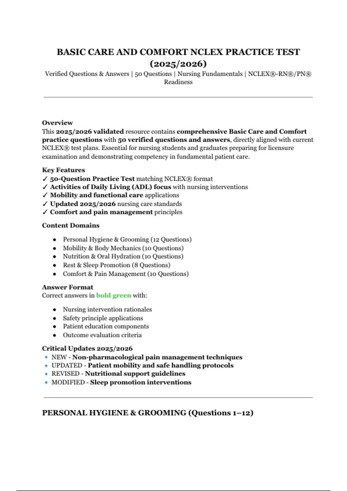 This 2025/2026 validated resource contains comprehensive Basic Care and Comfort