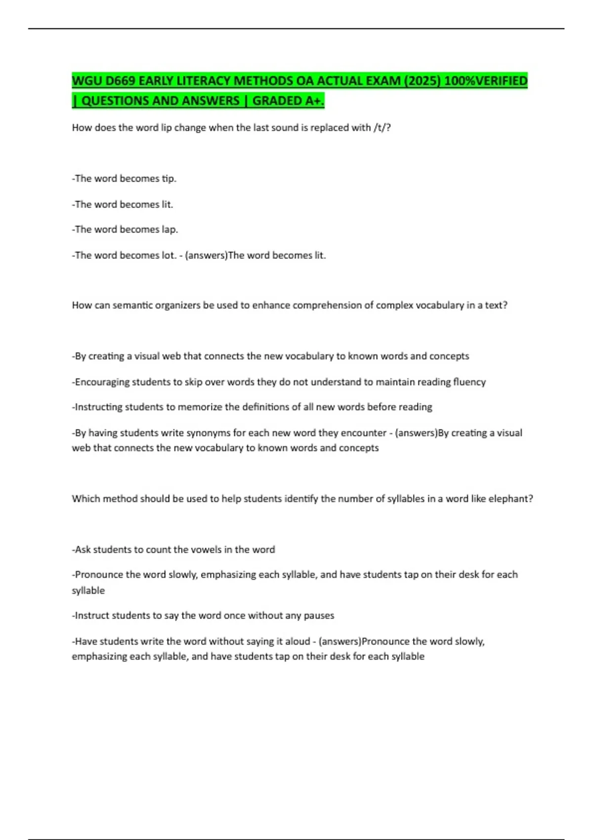WGU D669 EARLY LITERACY METHODS OA ACTUAL EXAM (2025) 100%VERIFIED | QUESTIONS AND ANSWERS | GRADED A+.