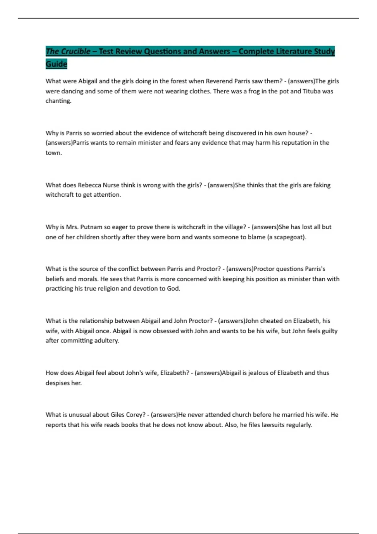 The Crucible – Test Review Questions and Answers – Complete Literature Study Guide