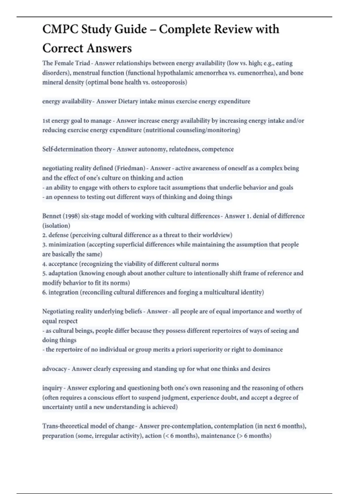 This document provides a comprehensive study guide for the Certified Mental Performance Consultant (CMPC) exam, featuring correctly verified answers for each topic. It covers essential domains such as applied sport psychology, performance enhancement techniques, ethical practice, consultation strategies, and psychological skill training. The guide is organized to help students and professionals master CMPC concepts efficiently and prepare confidently for certification.
