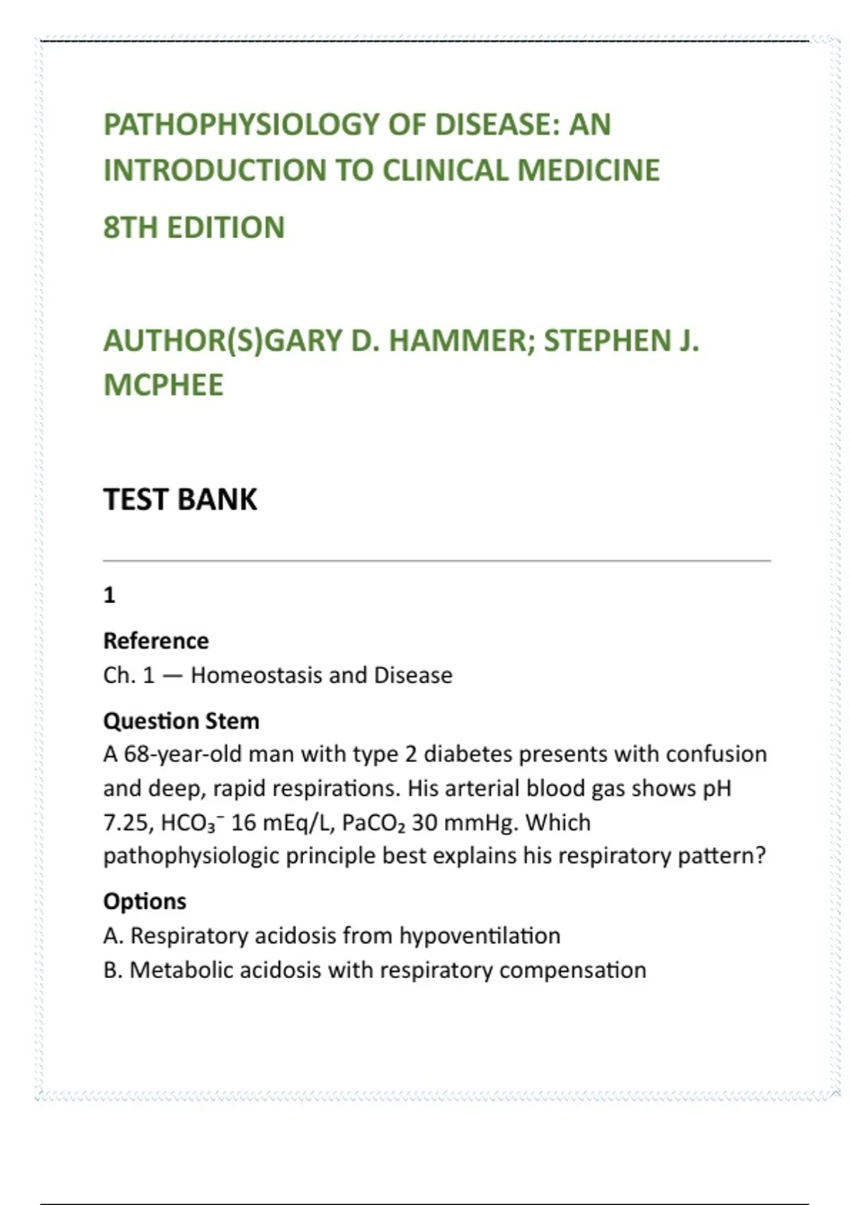 Pathophysiology of Disease — 8th Edition Test Bank | Full-Chapter 20 MCQs/Chapter • Clinical Medicine Medical Exam Prep Description: Master clinical pathophysiology and accelerate your exam performance with this complete digital test bank built from Pathophysiology of Disease: An Introduction to Clinical Medicine (Hammer & McPhee, 8th ed.). Designed for medical, PA, nursing, and allied health students, this resource delivers systematic, high-yield practice: every chapter mapped to the textbook with 20 original multiple-choice questions per chapter, each question paired with the correct answer and a verified, clinically focused rationale. Save study time with targeted practice that builds confidence and deepens understanding of disease mechanisms, diagnostic reasoning, and clinical application — proven to raise scores on NCLEX, HESI, USMLE Step exams, and in-class assessments. Ideal for rapid review, structured self-study, and group practice sessions. Features: • FULL textbook coverage — every chapter from Hammer & McPhee’s 8th Edition. • 20 MCQs per chapter with correct answers and evidence-based rationales. • Exam-focused formatting for NCLEX, HESI, USMLE, nursing and PA exams. • Downloadable digital file for instant access and offline study. • Organized by chapter and topic for efficient spaced repetition. • Instructor-friendly: ready-made practice sets and exam creation. Trust the authoritative framework of Hammer & McPhee’s clinical pathophysiology while using practice items written and verified for exam relevance. This test bank is a time-saving, confidence-building study system that converts textbook mastery into measurable exam results. Keywords: Pathophysiology of Disease test bank clinical medicine test bank Hammer & McPhee 8th edition 20 MCQs per chapter medical exam prep test bank NCLEX pathophysiology questions USMLE pathophysiology practice nursing test bank pathophysiology Hashtags: #Pathophysiology #ClinicalMedicine #MedicalExamPrep #TestBank #HammerMcPhee #NCLEXPrep #USMLEPrep #NursingEducation #MedStudentResources #20MCQs