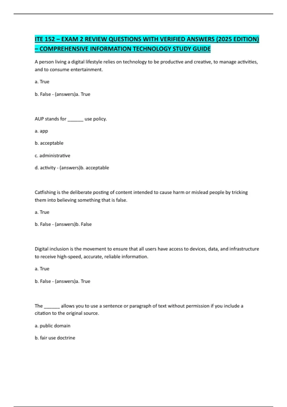 ITE 152 – EXAM 2 REVIEW QUESTIONS WITH VERIFIED ANSWERS (2025 EDITION) – COMPREHENSIVE INFORMATION TECHNOLOGY STUDY GUIDE