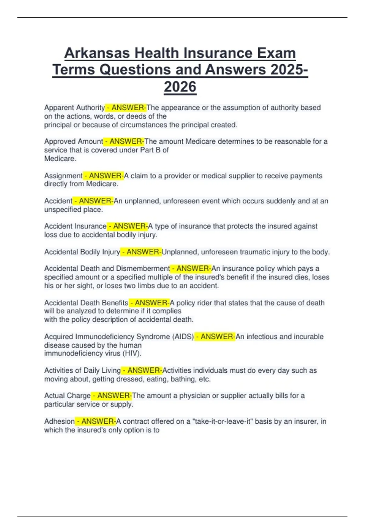 Arkansas Health Insurance Exam Terms Questions and Answers