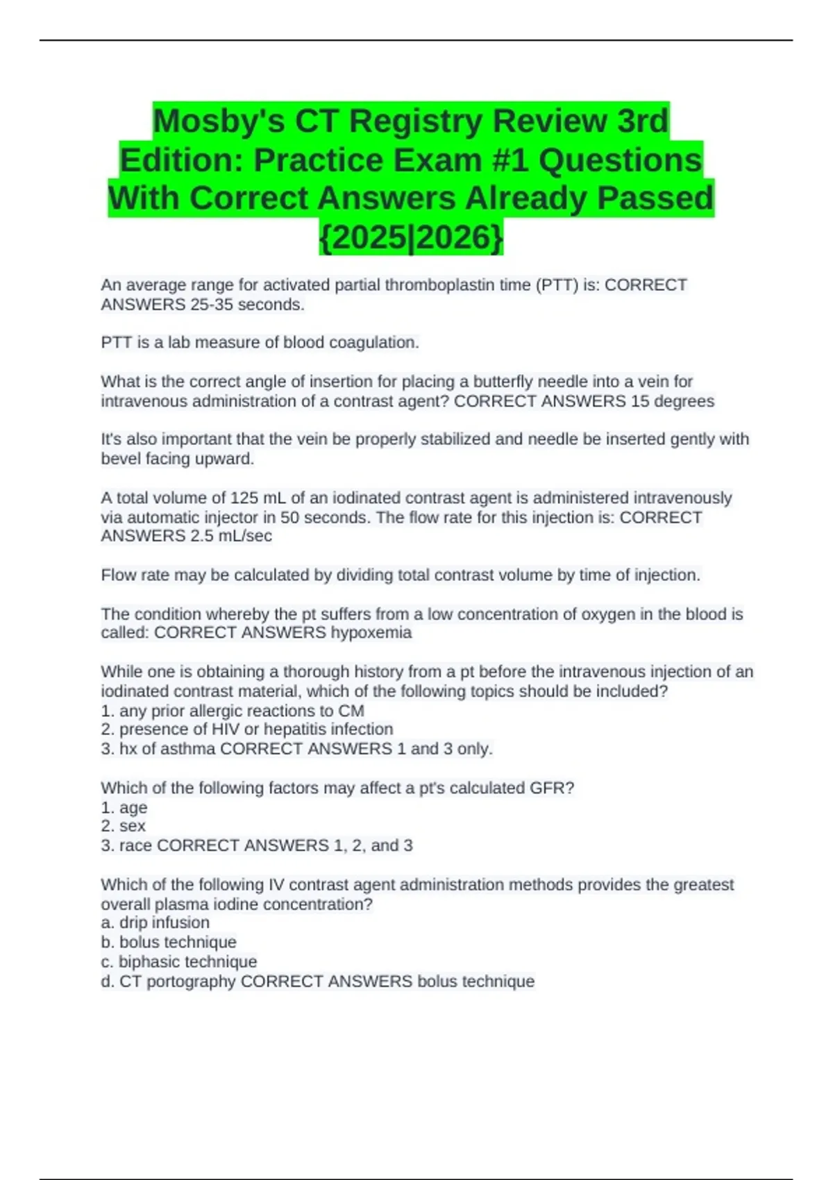 Mosby's CT Registry Review 3rd Edition: Practice Exam #1 Questions With Correct Answers Already Passed {2025|2026}
