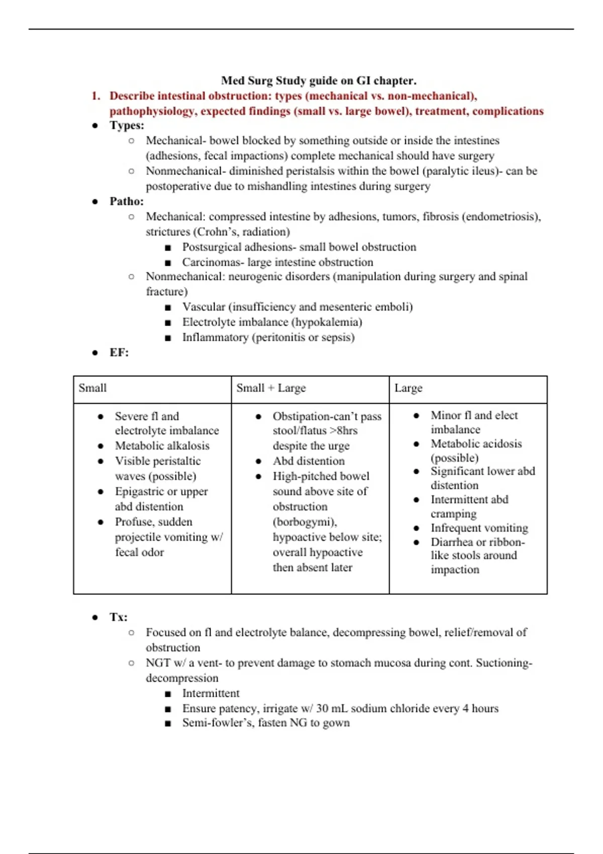 1. Describe intestinal obstruction: types (mechanical vs. non-mechanical),