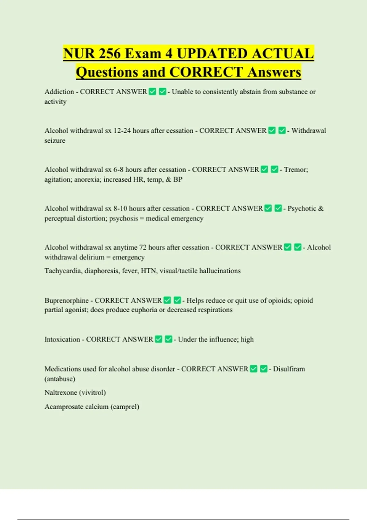 Alcohol withdrawal sx anytime 72 hours after cessation - CORRECT ANSWER - Alcohol