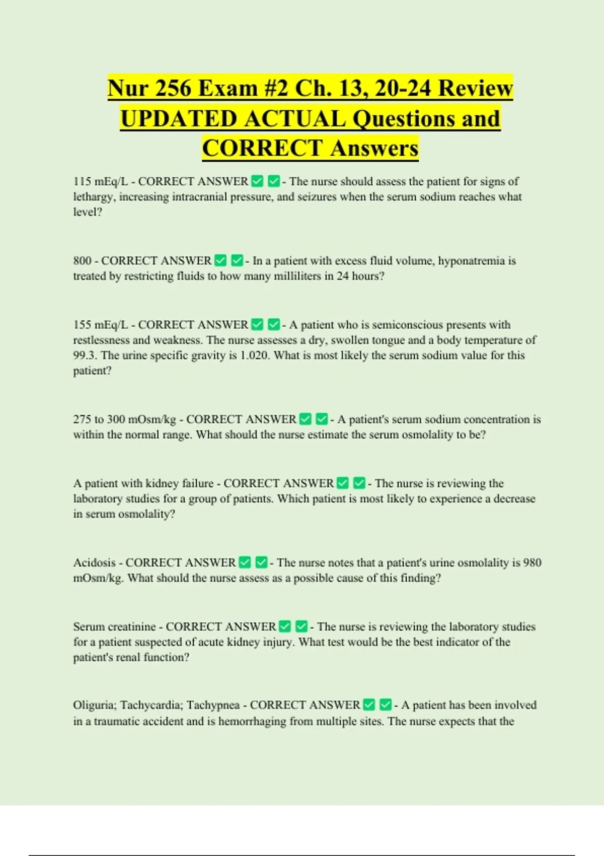 800 - CORRECT ANSWER - In a patient with excess fluid volume, hyponatremia is