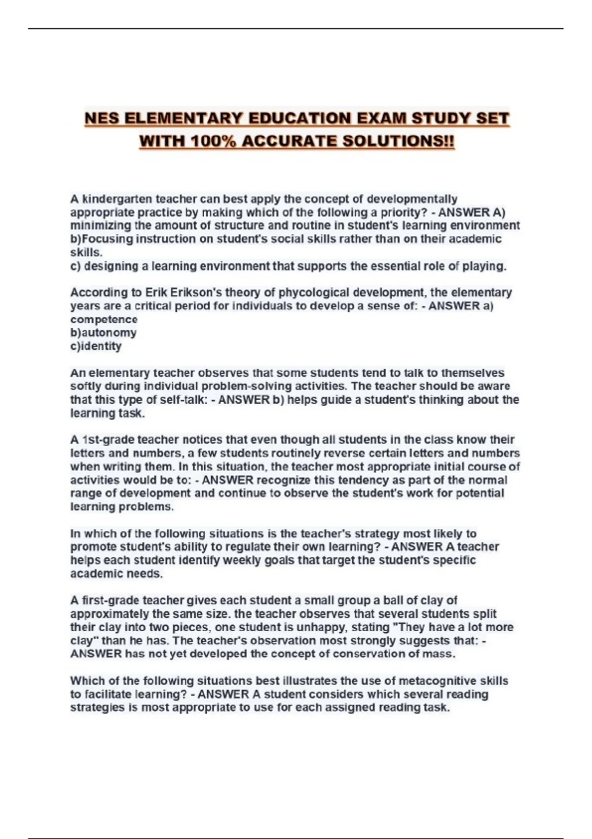 NES ELEMENTARY EDUCATION EXAM STUDY SET WITH 100% ACCURATE SOLUTIONS!!...