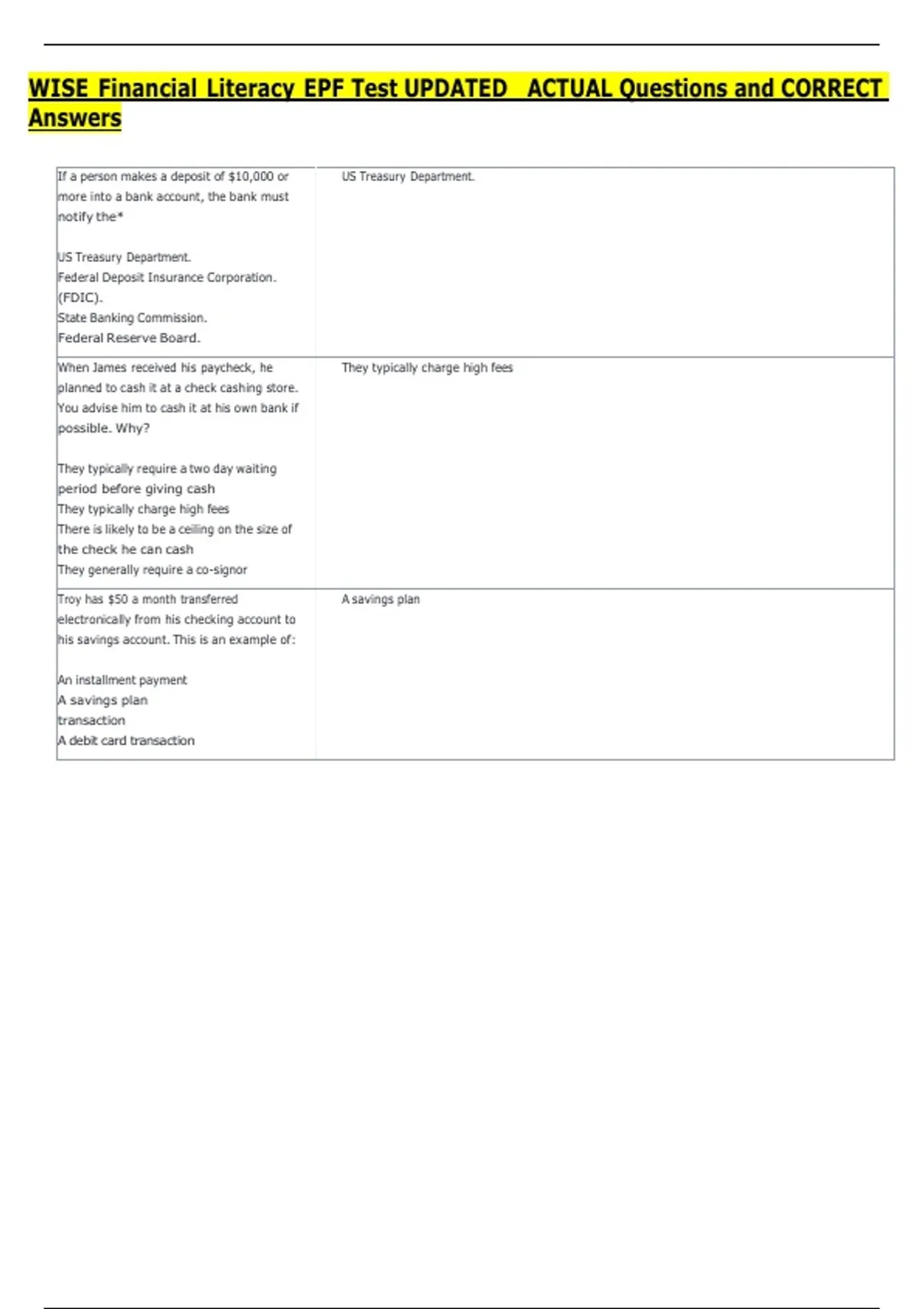WISE Financial Literacy EPF Test UPDATED ACTUAL Questions and CORRECT