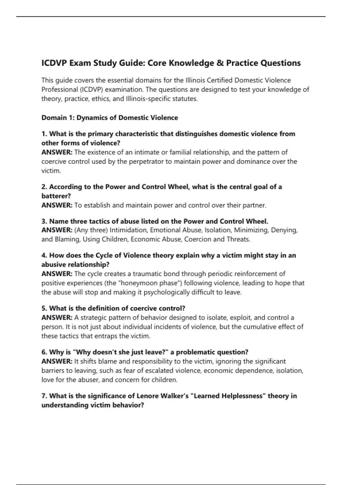 ICDVP Exam Study Guide: Core Knowledge & Practice Questions This guide covers the essential domains for the Illinois Certified Domestic Violence Professional (ICDVP) examination. The questions are designed to test your knowledge of theory, practice, ethics, and Illinois-specific statutes. Domain 1: Dynamics of Domestic Violence 1. What is the primary characteristic that distinguishes domestic violence from other forms of violence? ANSWER: The existence of an intimate or familial relationship, and the pattern of coercive control used by the perpetrator to maintain power and dominance over the victim. 2. According to the Power and Control Wheel, what is the central goal of a batterer? ANSWER: To establish and maintain power and control over their partner. 3. Name three tactics of abuse listed on the Power and Control Wheel. ANSWER: (Any three) Intimidation, Emotional Abuse, Isolation, Minimizing, Denying, and Blaming, Using Children, Economic Abuse, Coercion and Threats. 4. How does the Cycle of Violence theory explain why a victim might stay in an abusive relationship? ANSWER: The cycle creates a traumatic bond through periodic reinforcement of positive experiences (the "honeymoon phase") following violence, leading to hope that the abuse will stop and making it psychologically difficult to leave. 5. What is the definition of coercive control? ANSWER: A strategic pattern of behavior designed to isolate, exploit, and control a person. It is not just about individual incidents of violence, but the cumulative effect of these tactics that entraps the victim. 6. Why is "Why doesn't she just leave?" a problematic question? ANSWER: It shifts blame and responsibility to the victim, ignoring the significant barriers to leaving, such as fear of escalated violence, economic dependence, isolation, love for the abuser, and concern for children. 7. What is the significance of Lenore Walker's "Learned Helplessness" theory in understanding victim behavior? ANSWER: It describes a psychological state where a victim, after repeated and inescapable abuse, learns that they have no control over the situation and stops trying to leave, believing their efforts are futile. 8. How can cultural factors impact a victim's experience and response to domestic violence? ANSWER: Cultural factors can influence help-seeking behaviors, perceptions of family privacy, stigma, religious beliefs, immigration status, and trust in systems, which can either be barriers or sources of support. 9. What is the primary difference between a conflict in a relationship and domestic violence? ANSWER: Conflict is typically a disagreement between equals, while domestic violence is a pattern of coercive control where one partner systematically disempowers the other. 10. What is the "honeymoon phase" in the Cycle of Violence? ANSWER: A period of calm, remorse, and loving behavior from the abuser after an acute battering incident, which often reinforces the victim's hope for change. Domain 2: Direct Service and Advocacy 11. What is the primary role of a domestic violence advocate? ANSWER: To provide non-judgmental, client-centered support, empower the survivor to make their own decisions, ensure safety, and connect them with resources. 12. What is the first and most critical step in working with a domestic violence survivor? ANSWER: Conducting a lethality assessment and collaboratively developing a safety plan. 13. What are the three core components of a comprehensive safety plan? ANSWER: 1) Strategies while living with the abuser, 2) A detailed plan for leaving, including what to take and where to go, and 3) Safety after separation (home, work, court, etc.). 14. When is it appropriate to breach confidentiality with a client? ANSWER: Only under specific, mandated circumstances: 1) Suspected child abuse or neglect (DCFS report), 2) Suspected abuse of a person with a disability, 3) If the client poses a serious threat of violence to themselves or an identifiable other (Tarasoff duty), or 4) As required by a court order