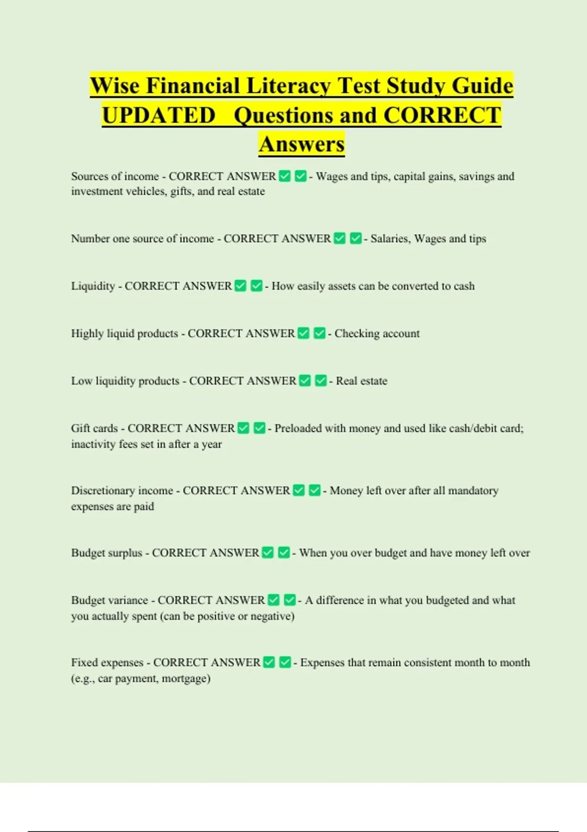 Wise Financial Literacy Test Study Guide UPDATED Questions and CORRECT Answers