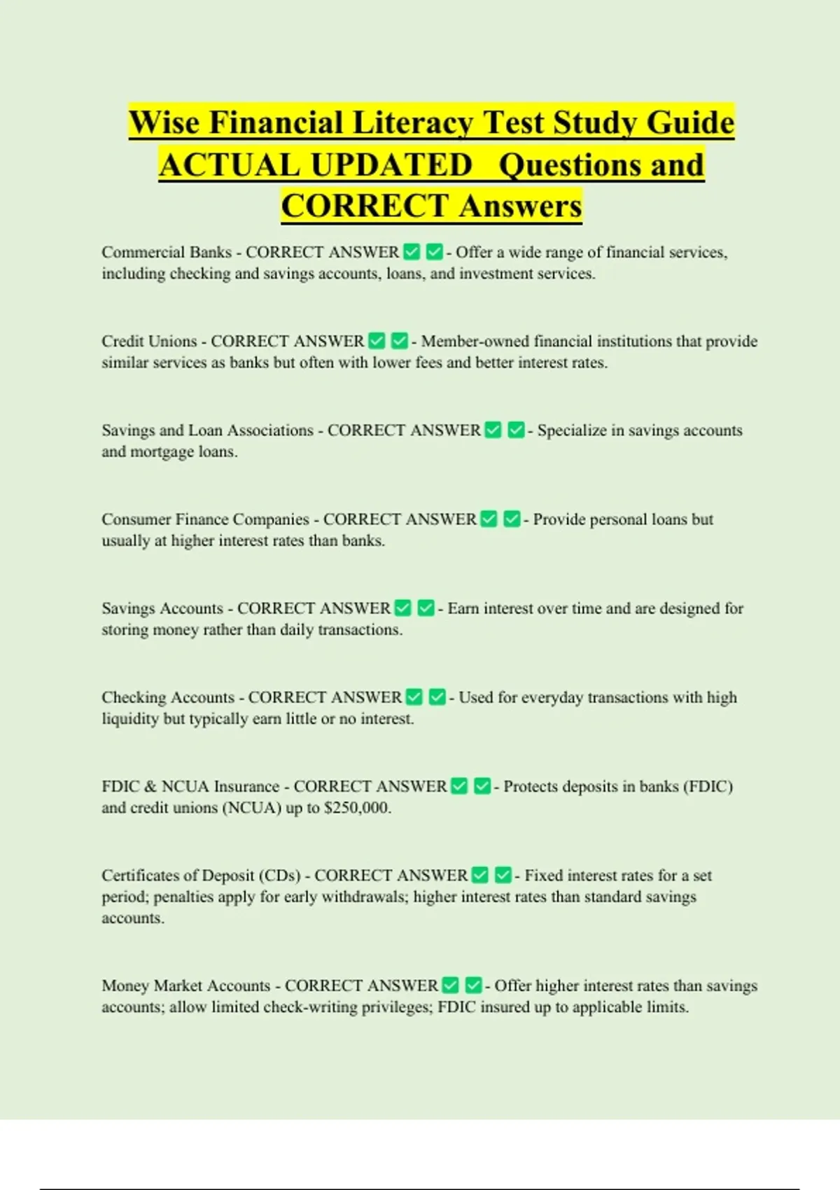 Wise Financial Literacy Test Study Guide ACTUAL UPDATED Questions and CORRECT Answers