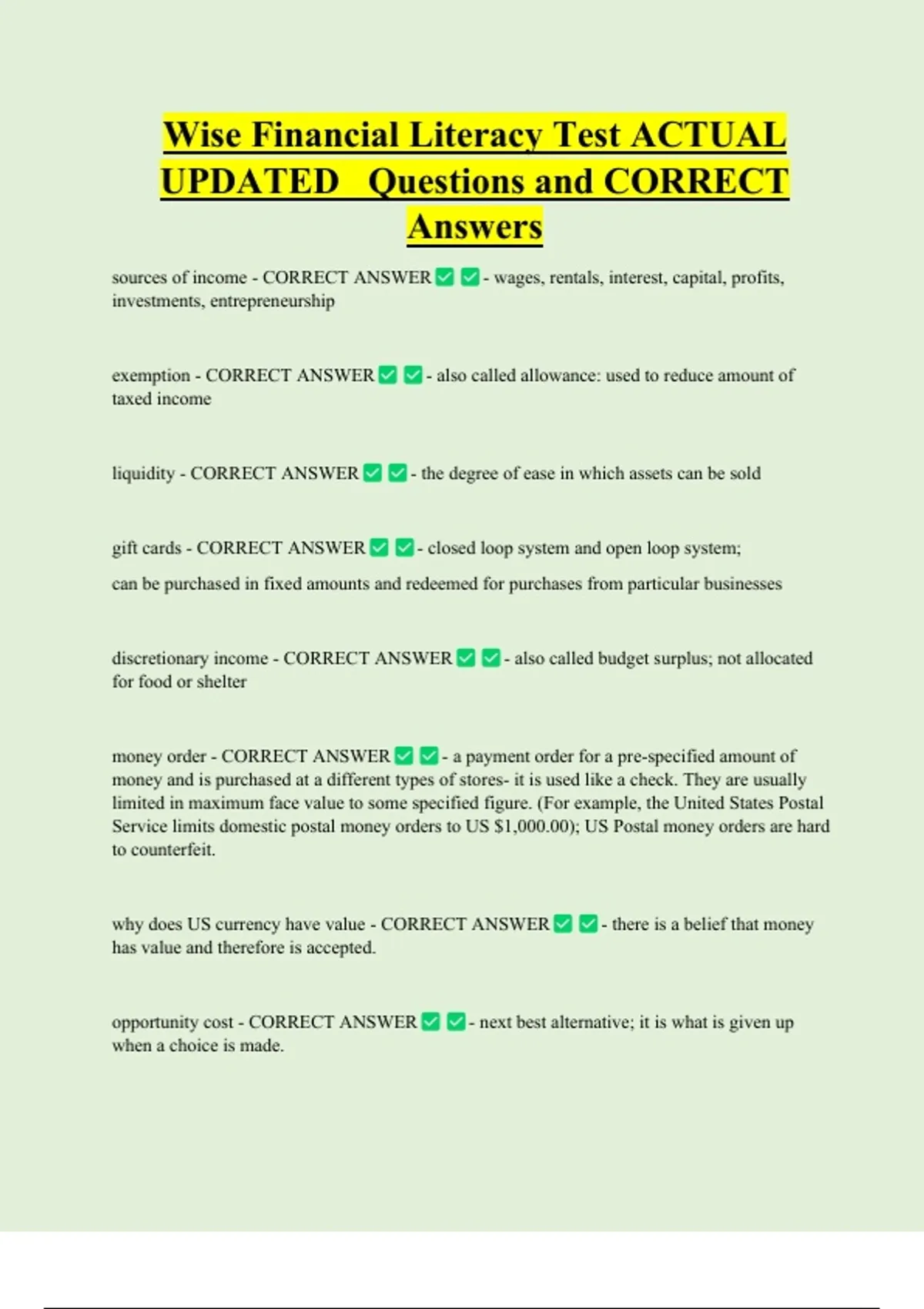 Wise Financial Literacy Test ACTUAL UPDATED Questions and CORRECT Answers