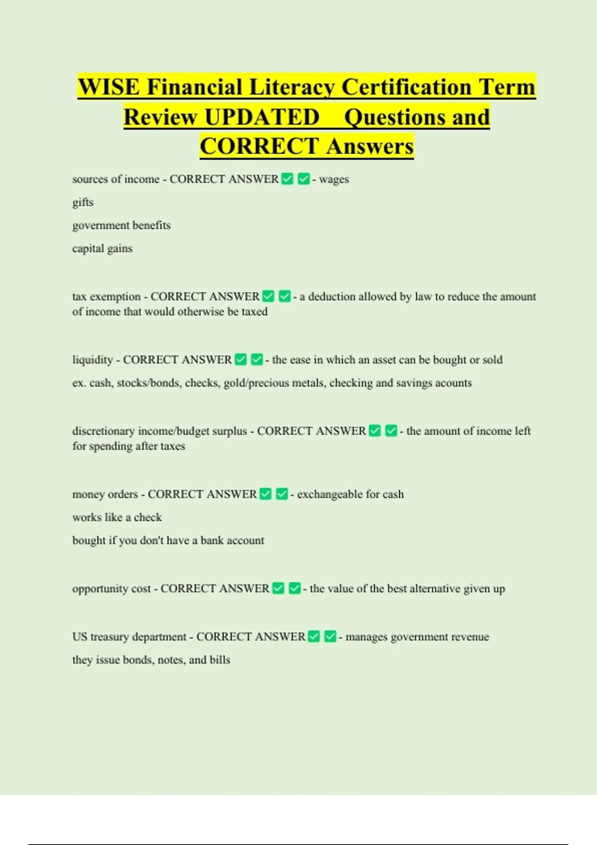 WISE Financial Literacy Certification Term Review UPDATED Questions and CORRECT Answers