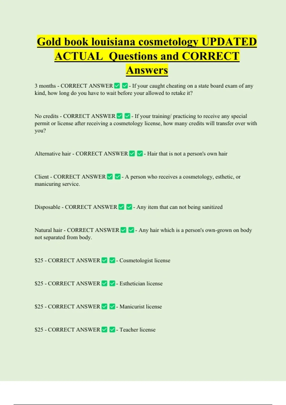 Gold book louisiana cosmetology UPDATED ACTUAL Questions and CORRECT Answers