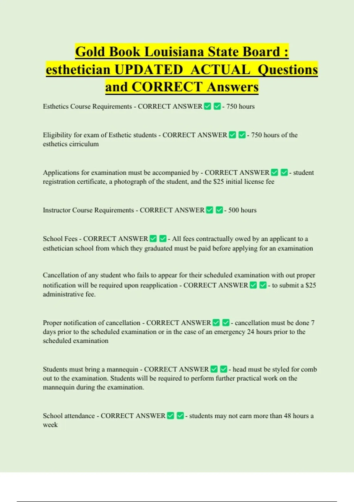 Gold Book Louisiana State Board : esthetician UPDATED ACTUAL Questions and CORRECT Answers