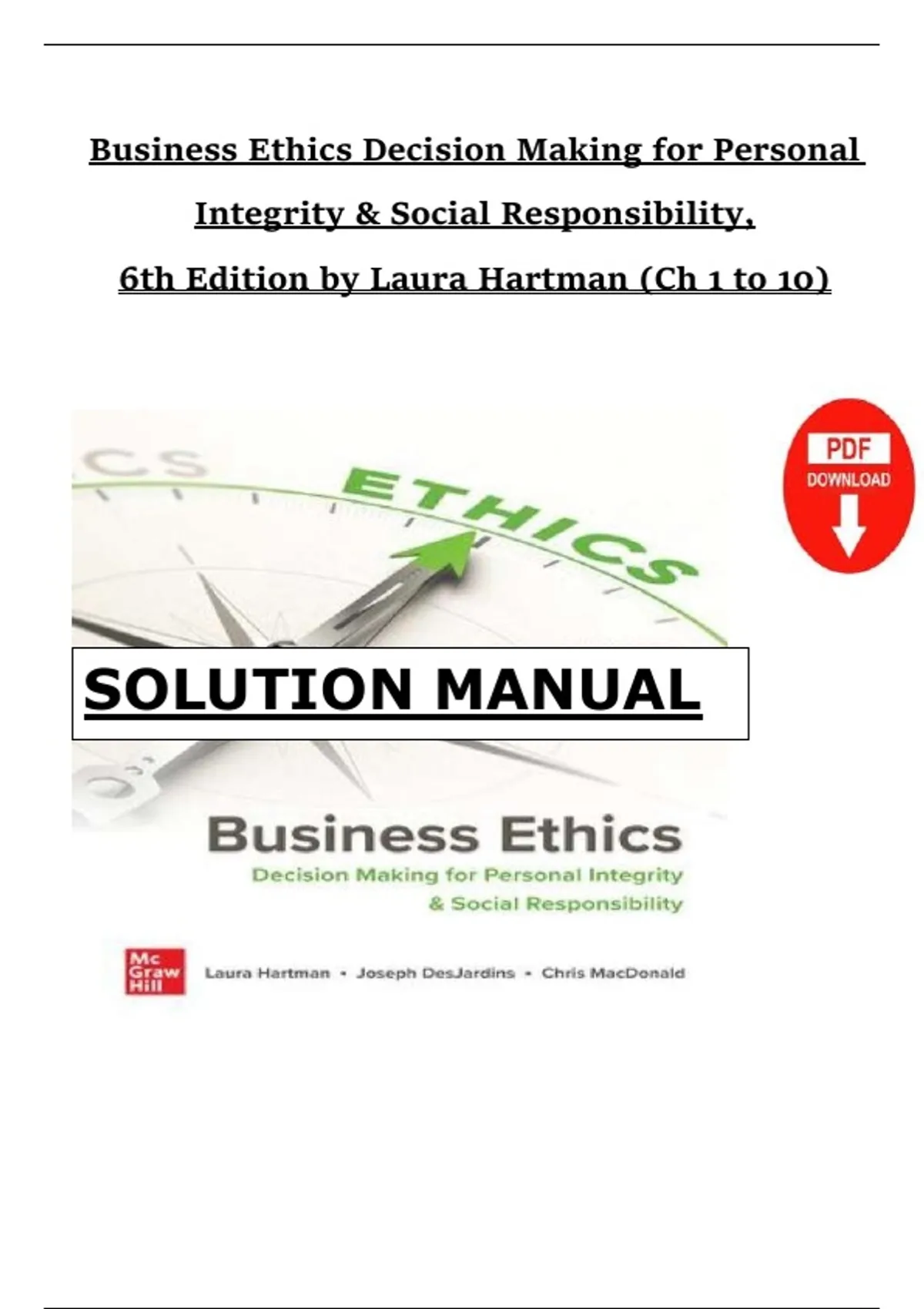 Complete and professionally verified solutions manual for Business Ethics: Decision Making for Personal Integrity & Social Responsibility, 6th Edition by Laura P. Hartman, covering all 10 chapters in detail. This resource provides comprehensive solutions, case analyses, and ethical decision-making frameworks designed to help students, educators, and professionals navigate real-world business dilemmas with integrity and accountability. Topics include corporate social responsibility, ethical leadership, stakeholder theory, sustainability, global business ethics, and moral reasoning. Ideal for exam preparation, academic coursework, and developing ethical competence in business and management contexts.