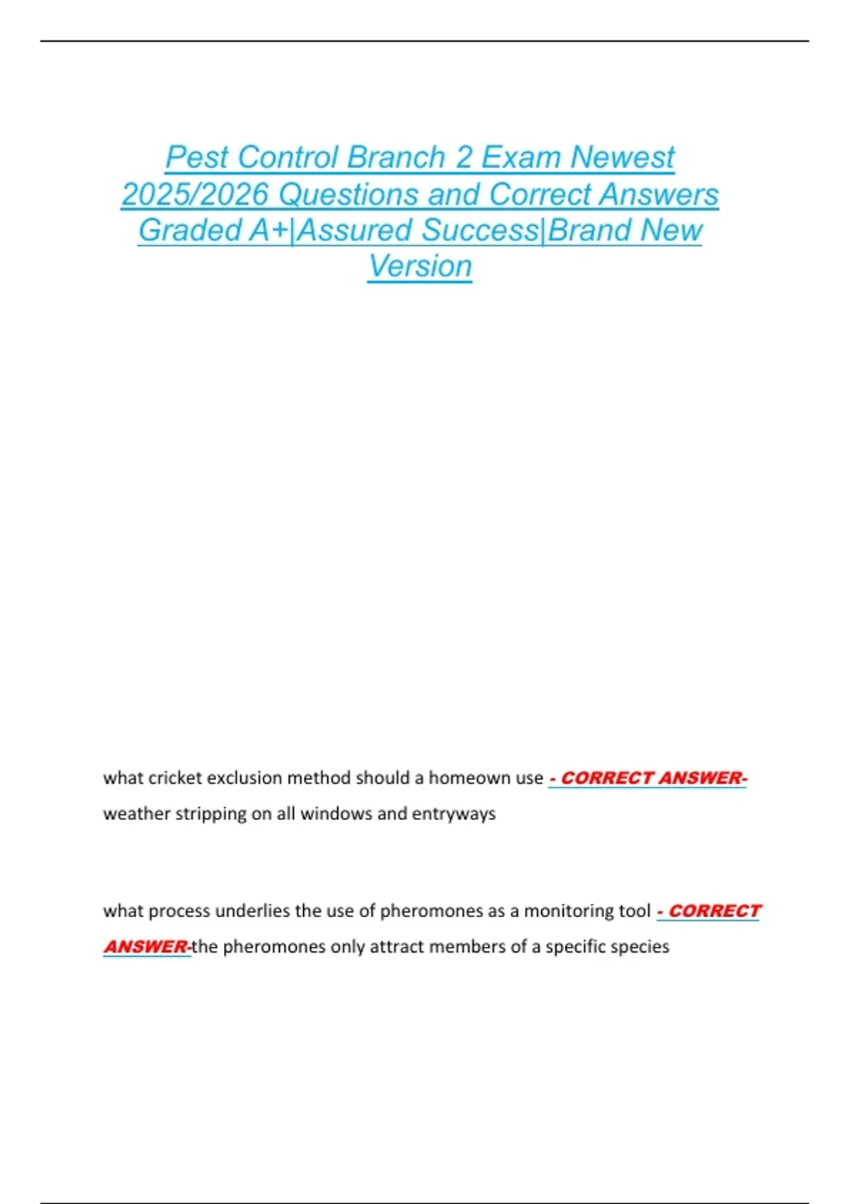 Pest Control Branch 2 Exam Newest 2025/2026 Questions and Correct Answers Graded A+|Assured Success|Brand New Version